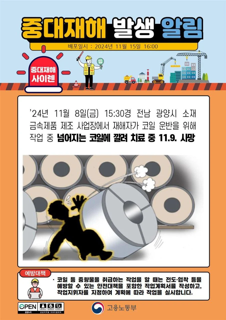 텔레그램이라는 sns로 노동안전보건채널을 구독하고 있다. 이 채널은 각종 노동안전과 관련된 소식을 공유해주는데, 그 중엔 상당수가 고용노동부에서 배포하는 '중대재해 발생 알림'이다. 이 알림은 하루에도 몇 번씩 노동자의 사망 소식을 전한다. 처음에는 경각심을 주는 것 같았지만, 어느 순간 섬뜩하고 기괴하게 느껴졌다. 매일같이 반복되는 소식들을 듣고 있자니 '노동자의 목숨이 얼마나 보잘 것 없는지 보세요'라고 놀리는 것처럼 느껴지기까지 한다. 한 사람의 삶이, 그 사람을 지탱하던 세계가 무너진 사건이 육하원칙에 맞춰 정리된 한두 문장과 일러스트 하나에 다 담길 수 있나.