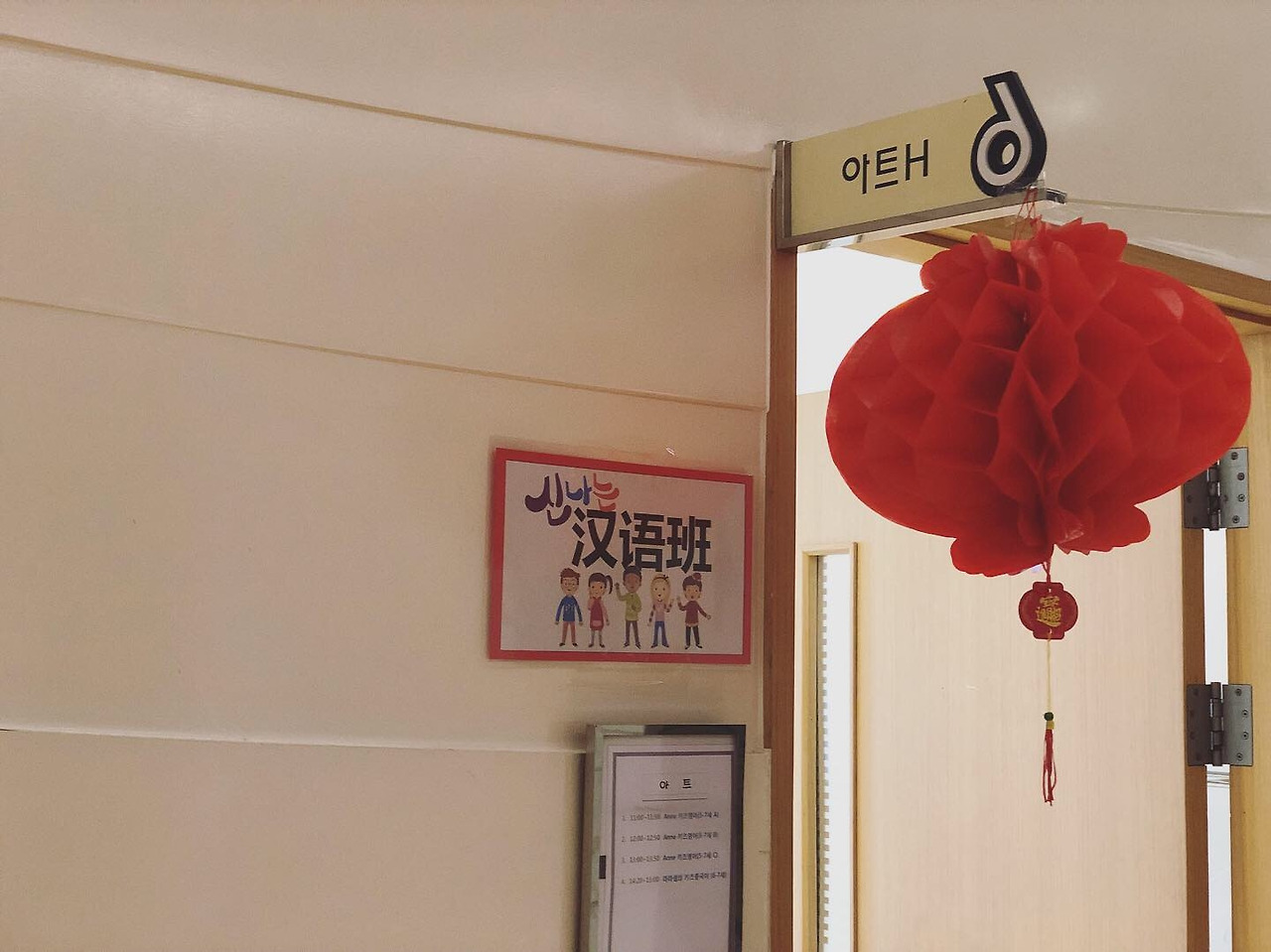 내 강의실! 중국어 수업답게 홍등도 걸고, 직접 만든 문패도 붙여 놓았다.