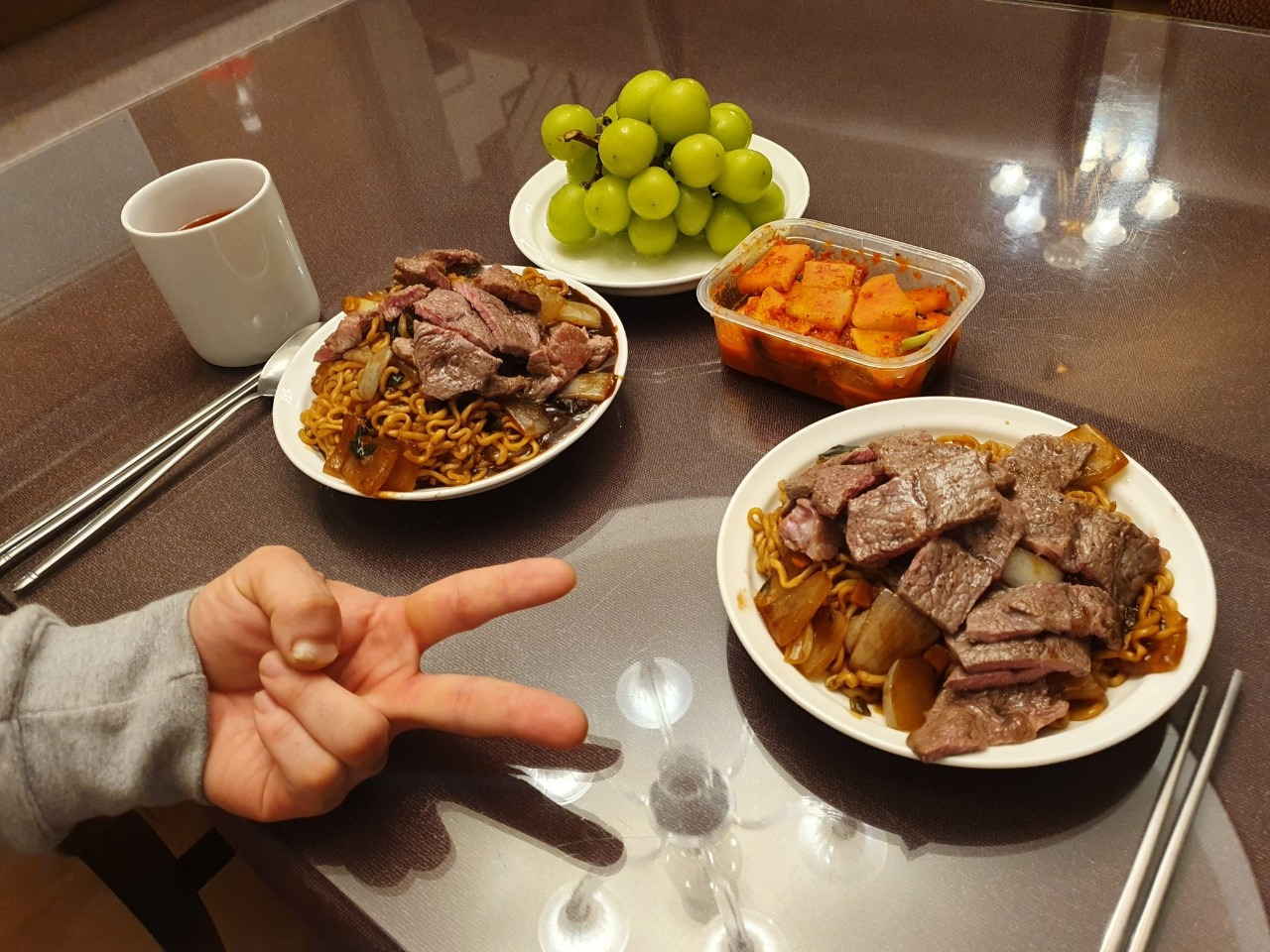 짜파구리를 먹고 싶다고 한 날, 나는 라면을 끓이고 남편은 옆에서 스테이크를 구웠다. 짜장 라면과 통통한 라면을 맛있게 섞는 방법은 우리나라 사람이라면 잘 알고 있으리라. 잘 구운 스테이크를 예쁘게 잘라서 탑을 쌓듯이 얹으면 고급 라면으로 탈바꿈되고 그렇게나 꿀맛이다. 한 그릇으로는 부족해서 리필을 요청하게 된다. 이때 김치나 깍두기가 빠지면 섭섭하다. 개인적으로 짜파구리에는 섞박지를 먹는 편이다. 맛도 좋지만, 모양이 비슷해서 식사하는 동안 시각적으로 재밌기 때문이다.