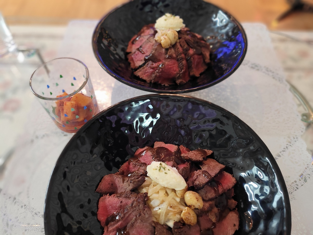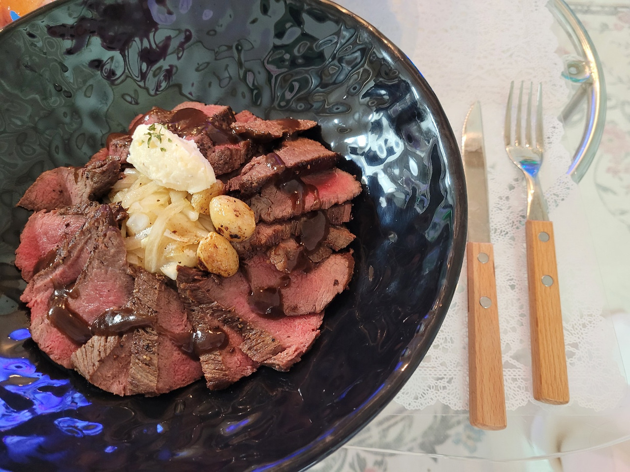 든든히 먹고 싶다면 스테이크 덮밥으로 먹으면 된다. 나는 레어를 좋아하고 남편은 미디엄 레어를 좋아한다. 분란이 없도록 적절한 균형을 맞추어서 고기를 굽는다. 간장과 식초, 설탕에 절인 양파를 데코하고 구운 마늘도 넣는다. 그리고 스테이크를 먹을 때마다 빠지지 않는 매시 포테이토를 예쁜 모양으로 얹으면 군침이 절로 나온다. 외식이 땡기지만, 외식을 못한 날에는 유명한 레스토랑 메뉴를 따라해서 버터치즈 고구마를 함께 한다. 그러면 스테이크를 먹은 날에는 기운이 마구 넘쳐서 강아지와 산책도 세 번은 거뜬히 할 수 있을 정도가 된다. 뽀빠이에겐 시금치가 있듯이 나에겐 스테이크가 있는 셈이다.