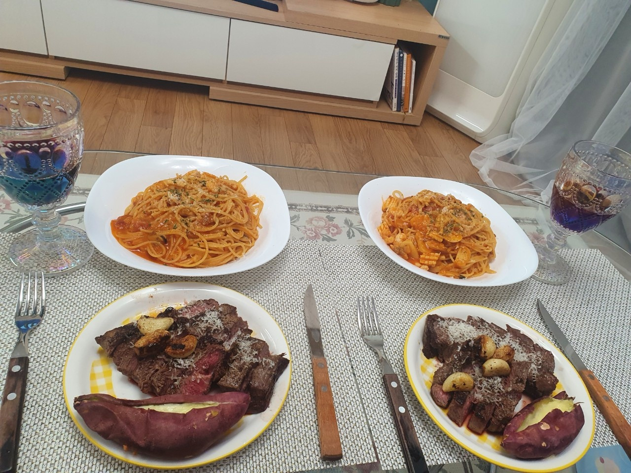 토마토 스파게티와 버터치즈 고구마를 곁들인 스테이크