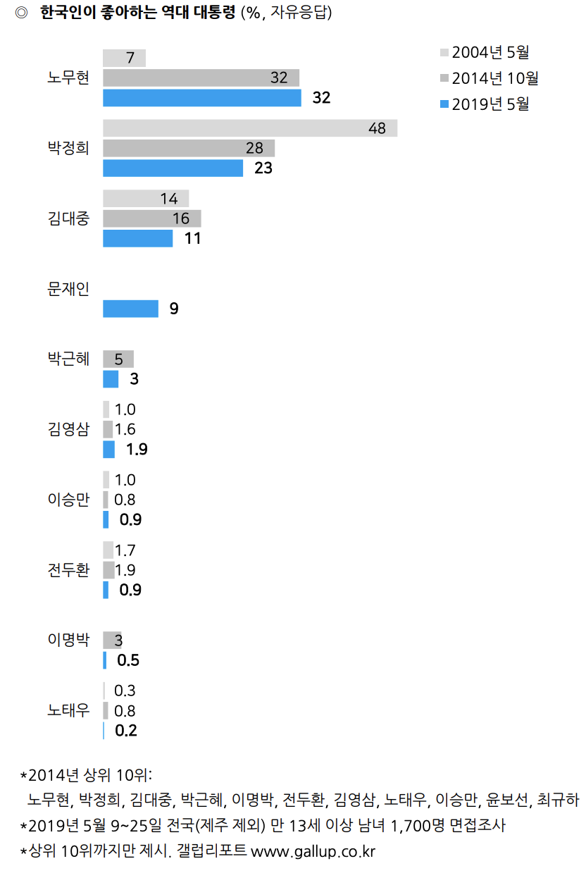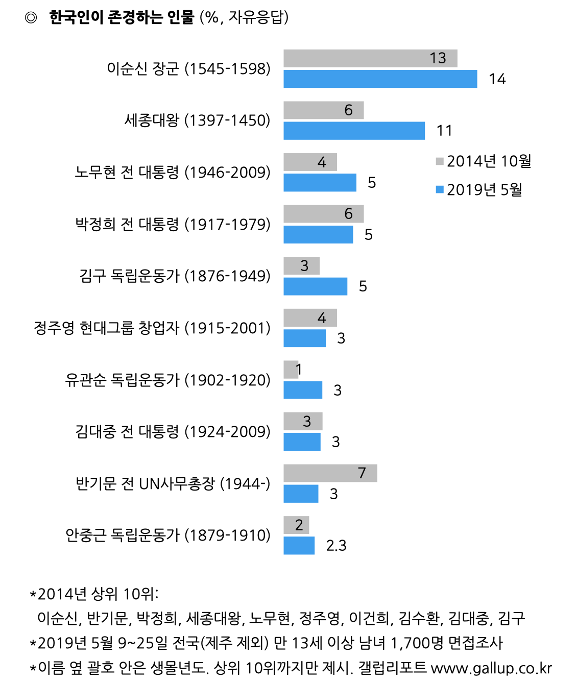 여론조사 업체인 갤럽은 2004년, 2014년, 2019년 3번에 걸쳐 <한국인이 좋아하는 40가지>라는 주제로 설문조사를 했다. 이 조사의 [사람 편]에는 스포츠 선수, 연예인, 역대 대통령, 존경하는 인물 등이 항목으로 있는데 그 결과의 변화가 무척 흥미롭다.