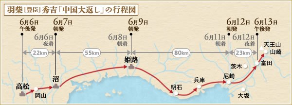 음력 1582년 '6월 2일' 혼노지에서 오다 노부나가가 죽었을 때 히데요시는 서쪽에서 모리 가문과 일전 중이었다. 그런데 히데요시는 어떻게 알았는지 소식을 듣자(6월 3일)마자 모리 가문과 1) 휴전을 맺고는 군사를 이끌고 2) 교토 인근까지 당도하여 3) '6월 13일'에 미쓰히데와의 회전에서 승리한다.