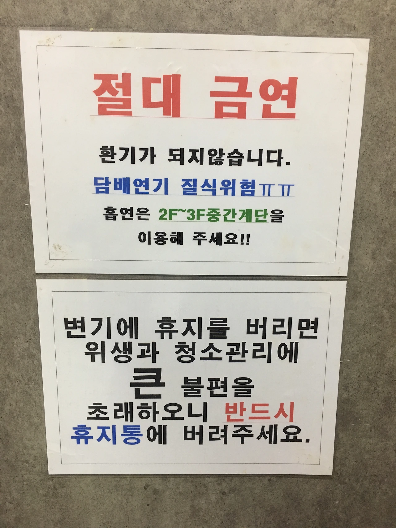공간은 홀이 25평 내외 정도 되어보인다. 촬영은 식사중인 손님들의 식사를 방해할 우려가 있어 홀 전체를 담지는 못했다.(게다가 나는 미스터리 쇼퍼같은 롤이므로...) 공간은 불필요한 인테리어가 없고 허세도 없다. 테이블 몇 개가 전부. 화장실은 가게 안에 있으며 남녀 공간이 별도로 완전 분리되어 있다. 화장실도 깔끔하다. 다만 좁고 창문이 없어 환기는 어렵다. 안내 문구는 다소 의아한데, 중간 계단도 결국 '실내'이기 때문에 담배를 피는 분들은 조금만 수고를 하시고, 1층에서 흡연하시는 것이 좋을 것 같다.