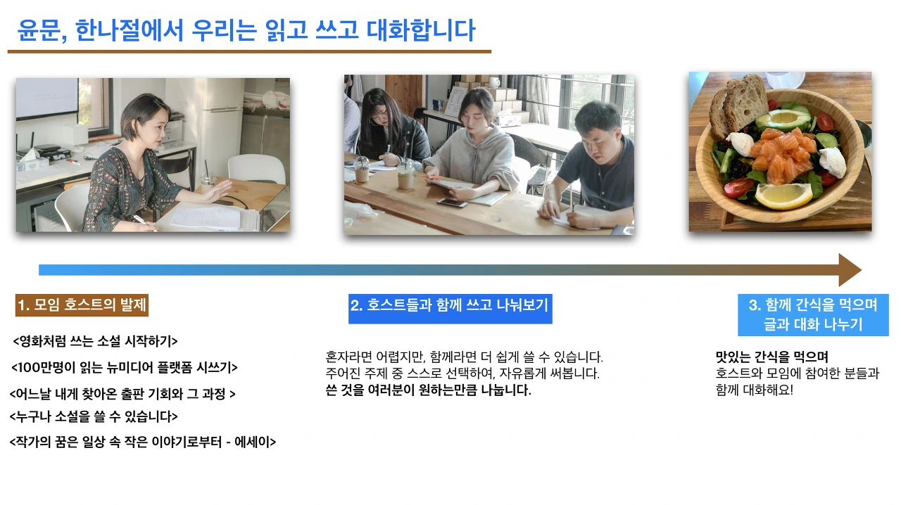 함께하는 6시간동안 우리는 함께 쓰고 읽고 때로는 먹으며 함께 대화합니다.