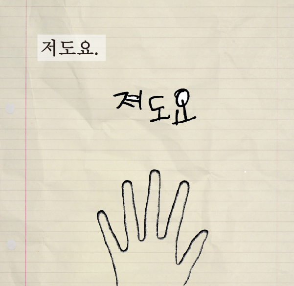 "죄송해요, 미안해요, 부끄러워하면서 그림을 보여주고 있네요."