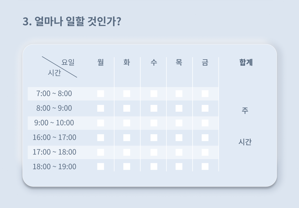 자, 벌고 싶은 급여도 내 시급도 정해보았습니다. 이제 얼마나 일하면될지를 정해보면서 시급과 목표 급여를 조정해보겠습니다.