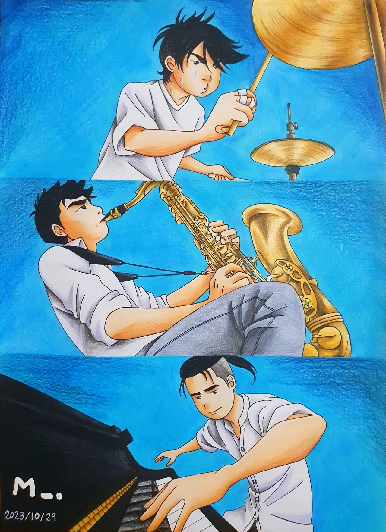 영화 속에 수록된 인물들이 연주하는 재즈음악도 전부 좋았다. 이 부분은 연주자들이 특히나 인물의 특성을 살리기 위해 많은 공을 들였다고 하는데 그래서인지 다이가 연주하는 색소폰에서는 두려움 없는 강한 소리가 슌지의 드럼에서는 조금 실수도 있으나 열심히 따라가려는 열정이 유키노리의 피아노는 영화가 후반부를 향해갈수록 안정적인 리듬에서 벗어난 변주를 시도할 정도로 성장한 모습이 느껴졌다.
