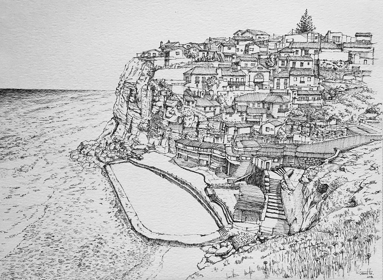 가방에서 펜을 꺼내 마을의 모습을 종이에 담기 시작한다.