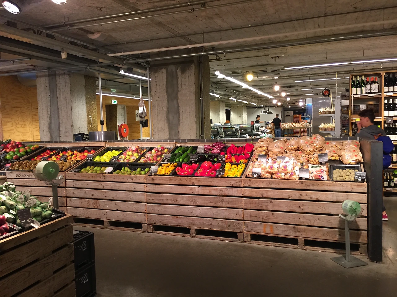 매장을 들어서면 분위기는 시장 같은 느낌을 주는데, 내부의 재료를 인위적이거나 플라스틱 같은 환경에 문제를 일으키는 재질은 최소화 한 점이 돋보인다. 바닥 벽 천장의 재료가 건물의 내부 인테리어를 철거하고 거친 부분만 다듬은 정도의 마감을 했다. 바닥은 에폭시 코팅 정도 천정은 슬라브를 그대로 노출했다.