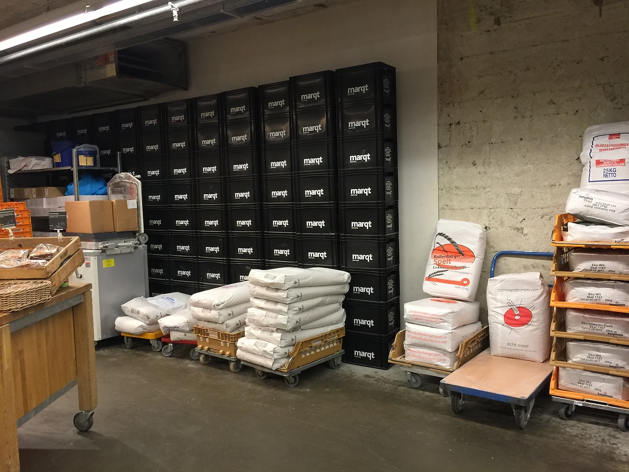 벽면의 한쪽에는 재생 플라스틱 상자가 가득 쌓여 있었는데 나중에 찾아보니 자전거에 달수 있는 상자였다.