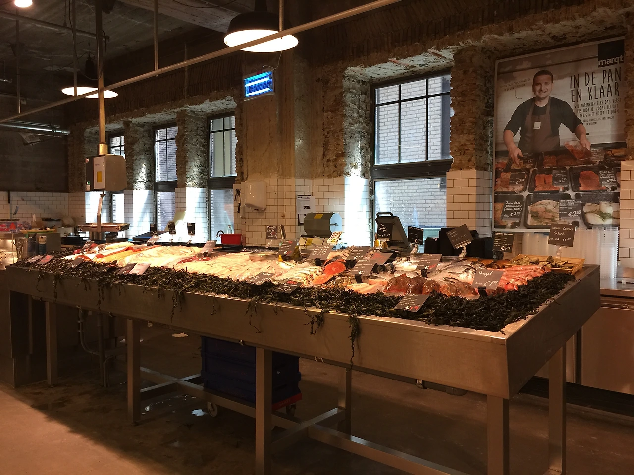 벽에 한 마감은 기껏해야 생선을 다루는 섹션에서 기능에 맞게 하부를 타일로 붙인 것이 전부이다. 생선을 다룰 때 아무래도 거친 벽은 오염이 되기 쉬우니까. 이렇듯 최대한 장식을 배제하고 기능적인 디자인만 최소화했다.