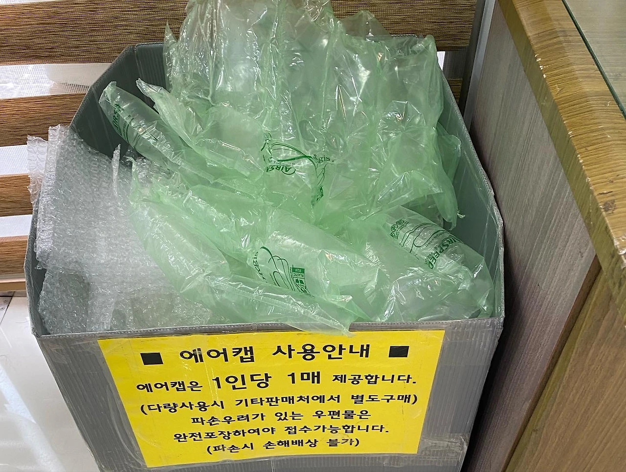 어느 날 우체국에서 에어캡 사용 안내 문구를 보고 직원에게 자원순환 차원에서 깨끗한 에어캡을 가져다줘도 되는지 물어본 후 집에 고이 모셔놓았던 에어캡을 우체국으로 가져갔다. 다행히 우체국에서 흔쾌히 가져오라고 하셔서 안심하고 가져가고 있다.
