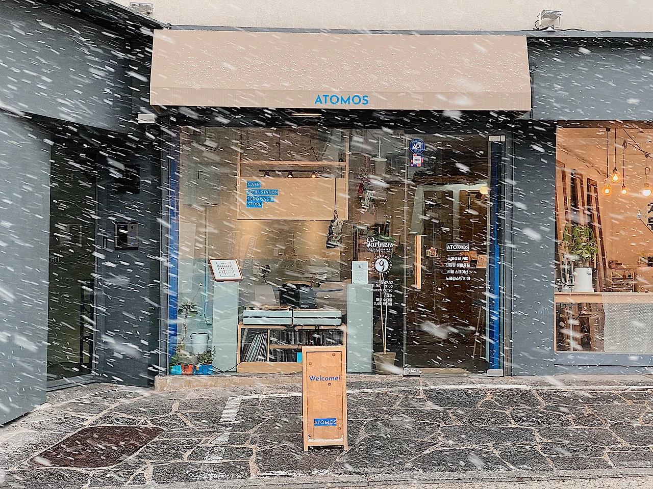 브랜드 네이밍을 할 때 첫 번째 후보였던 '우연한 산보'를 택하지 않은 이유가 무색하게 아토모스는 서울 성북동 인적 드문 골목에 자리 잡고 있다. 아토모스를 오픈하고 난 뒤 "어떻게 이런 가게를?" 다음으로 많이 받은 질문은 "왜 성북동(이 자리)에 오픈했어요?"였다.