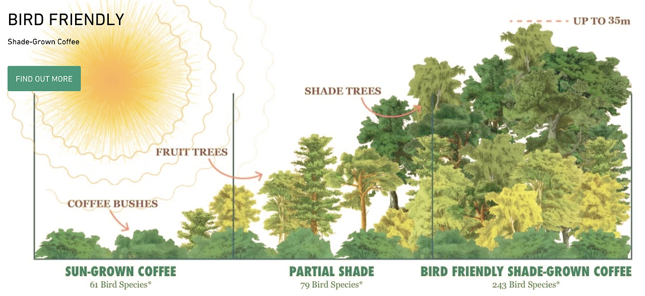 2015년 다보스포럼(World Economic Forum)은 지속 가능한 커피를 선택하는 방법으로 ‘Shade Coffee’를 소개한 바 있다. 열대림 벌채를 통해 조성되는 단일 커피 농장의 커피나무는 뜨거운 태양열로 수분이 부족하고 해충의 공격 대상이 되어 살충제에 대한 의존도가 높아지는 문제를 갖고 있다(살충제 사용은 수질오염을 일으키고 커피 생산지의 농민과 동·식물의 질병으로까지 이어진다).