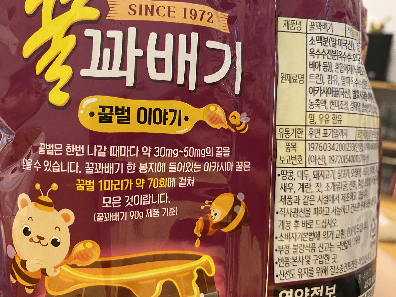 성분 확인 후 선택한 과자는 꼬깔콘과 꿀꽈배기. 소파에 앉아 열심히 꿀꽈배기를 먹던 중 발견한 정보는 아! 그럴 수 있겠다 싶은 내용을 담고 있었다. 엄격한 비건들은 꿀벌을 착취한다는 이유로 꿀을 먹지 않는다 했는데 꿀꽈배기 포장지 뒷면에 적혀있는 내용을 읽곤 그럴 만도 하다는 생각이 들었다. 꿀벌 1마리가 약 70회에 걸쳐 모은 양의 꿀을 나는 1,20분 만에 비웠다.