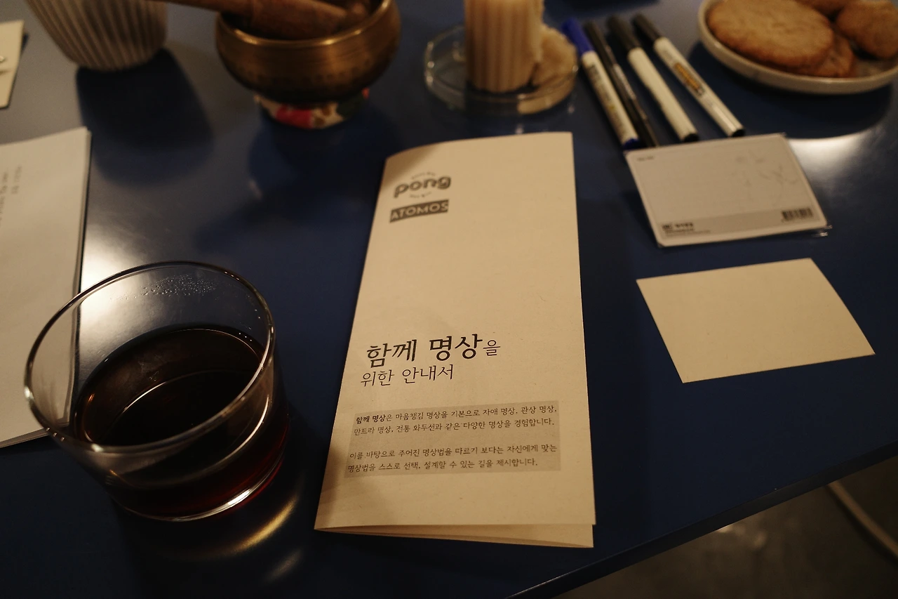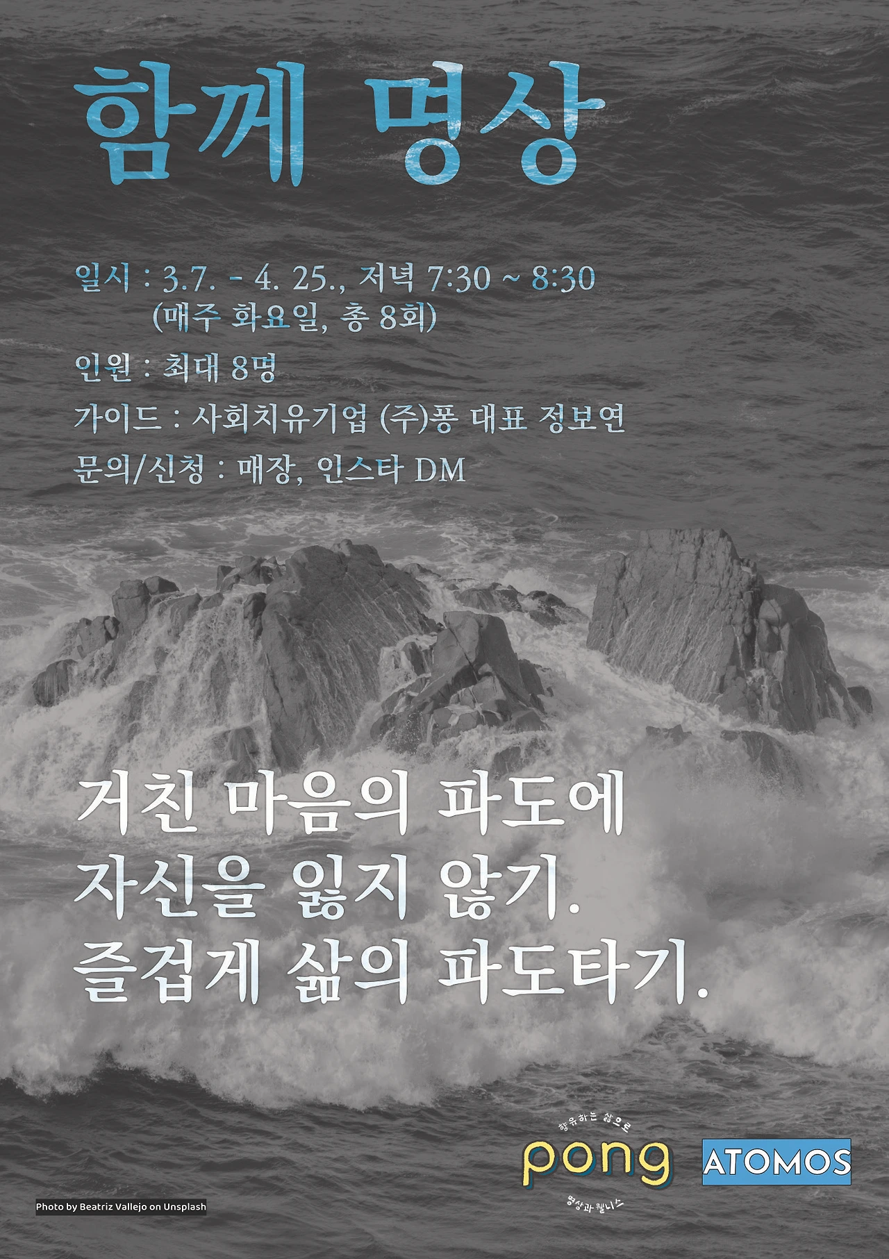 올해 3월부터 아토모스에서 사회치유기업 퐁(pong)과 함께 명상을 시작했다. '카페에서 명상이라니' 하는 마음과 '참여하는 사람이 없으면 어쩌지' 하는 두려운 마음이 있었지만 '그냥' 하기로 했다. 참여자가 없으면 없는 대로, 적으면 적은 대로.