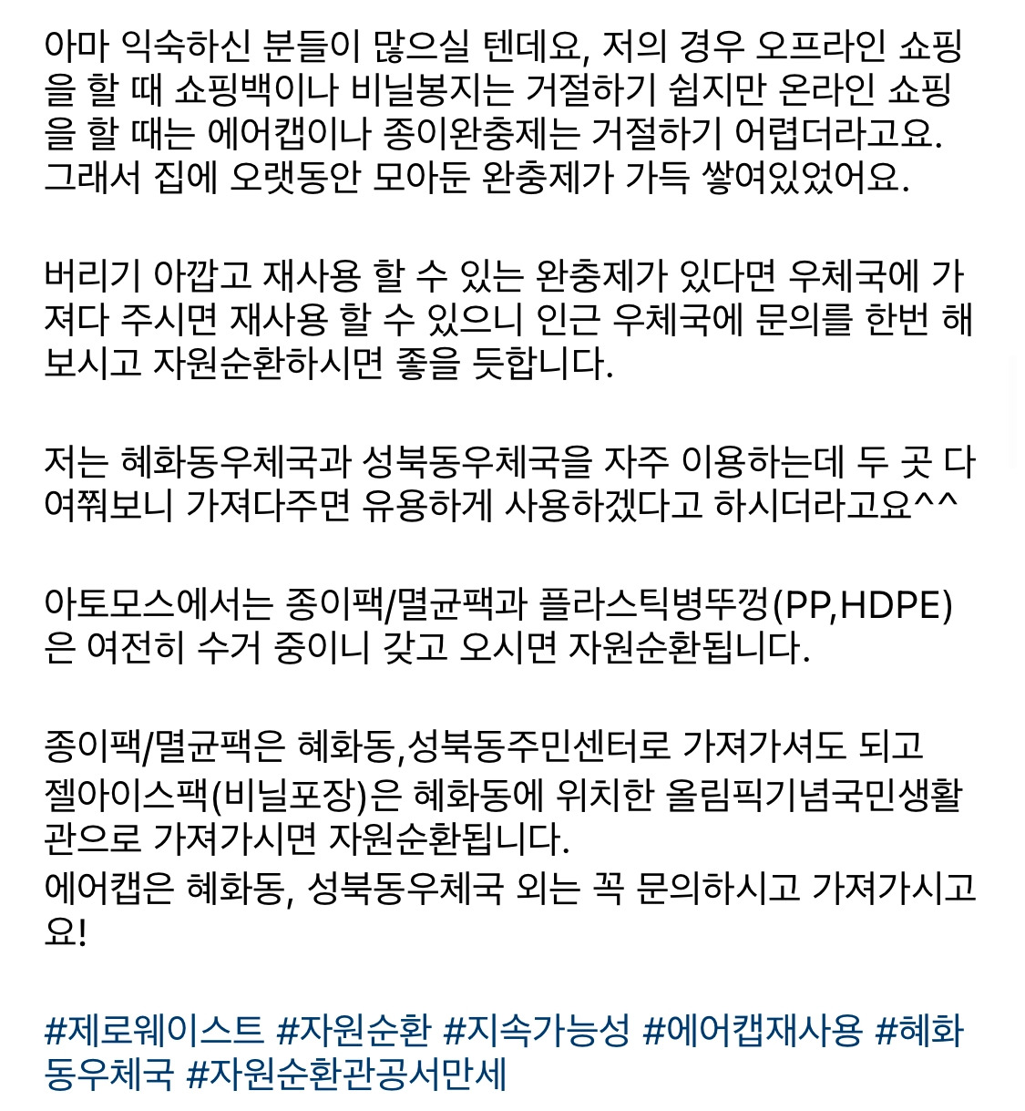 에어캡 박스를 처리하고 난 뒤에도 집과 매장에는 에어캡이 꾸준히 발생했기 때문에 에어캡이 쌓이면 우체국으로 가져갔다. 갈 때마다 우체국 직원으로 부터 고맙다는 인사를 들었다. 보냉팩이나 종이팩/멸균팩은 관공서에서 재사용을 위해 수거 공간을 마련하거나 재사용에 대한 홍보를 하고 있지만 에어캡 재사용에 대한 정보는 볼 수 없었던 터라 내가 모은 에어캡을 받아 준 우체국에게 감사한 마음이 아주 컸다.