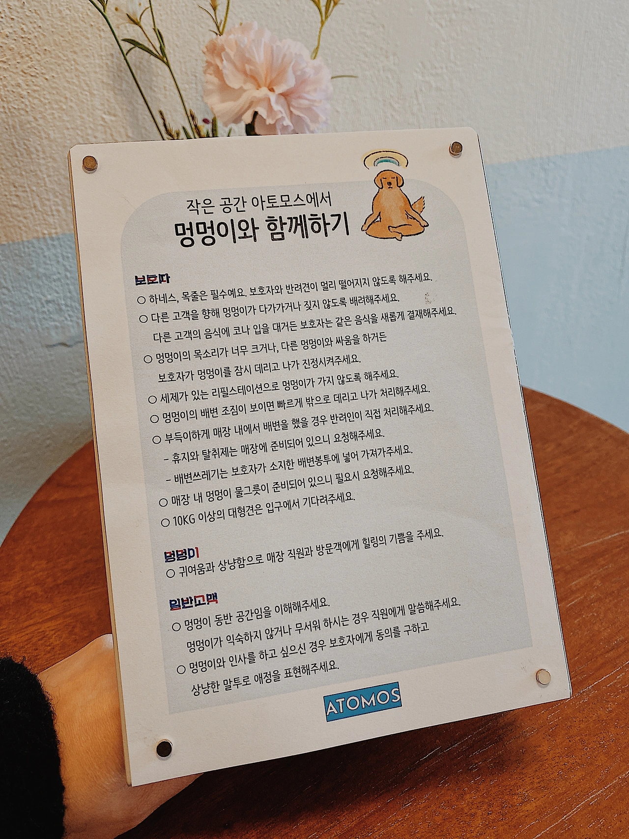 '책임감 빼면 시체'라는 글에서 썼듯 아토모스는 '차별없는 가게'를 지향한다. 차별없는 가게라는 캠페인에 참여하게 된 것은 '과거'의 배움과 일경험으로 지극히 나의 '비영리적'이고 '공공적' 관점에서 비롯되었다. 흔히 사회학이나 정책을 다루는 영역에서는 사회적 약자와 소수자가 안전하게 살 수 있는 곳이라면 모두에게 좋은 사회라고 이야기하곤 하니까. 그래서 아토모스는 시작할 때부터 노키즈존/노시니어존이 아니었으며, 약간의 규칙을 안내하고 반려동물 입장도 가능했으며, 휠체어가 들어와도 공간 상의 불편함이 적도록 테이블을 배치했다. 본래 규모 작은 공간에 테이블 간격을 여유롭게 두었더니 테이블이 4개밖에 배치되지 않았지만 그 여유로운 간격이 방문하는 모두에게 편안함을 주고 있는 것 같다.
