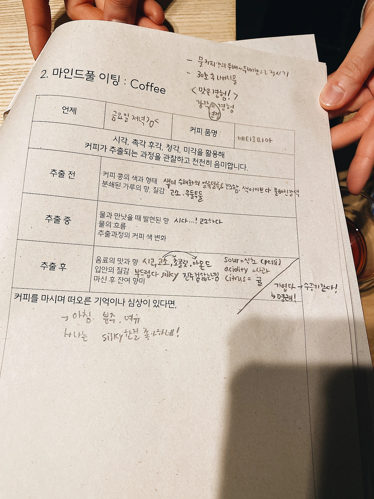 워크숍이 진행되는 시간 동안 참여자 모두 '맛있다/맛없다'라는 표현이 아닌 각자가 느낀 감각과 심상을 활용하였으니 마인드풀 이팅 워크숍은 성공적이었을까. 커피를 조금 더 깊숙이 즐기고 싶은 사람이라면 마인드풀 이팅을 통해 커피 마시기를 시도해 보면 좋을 듯하다. 혹은 아토모스에서 진행될 워크숍에 참여해도 좋지 않을까!!