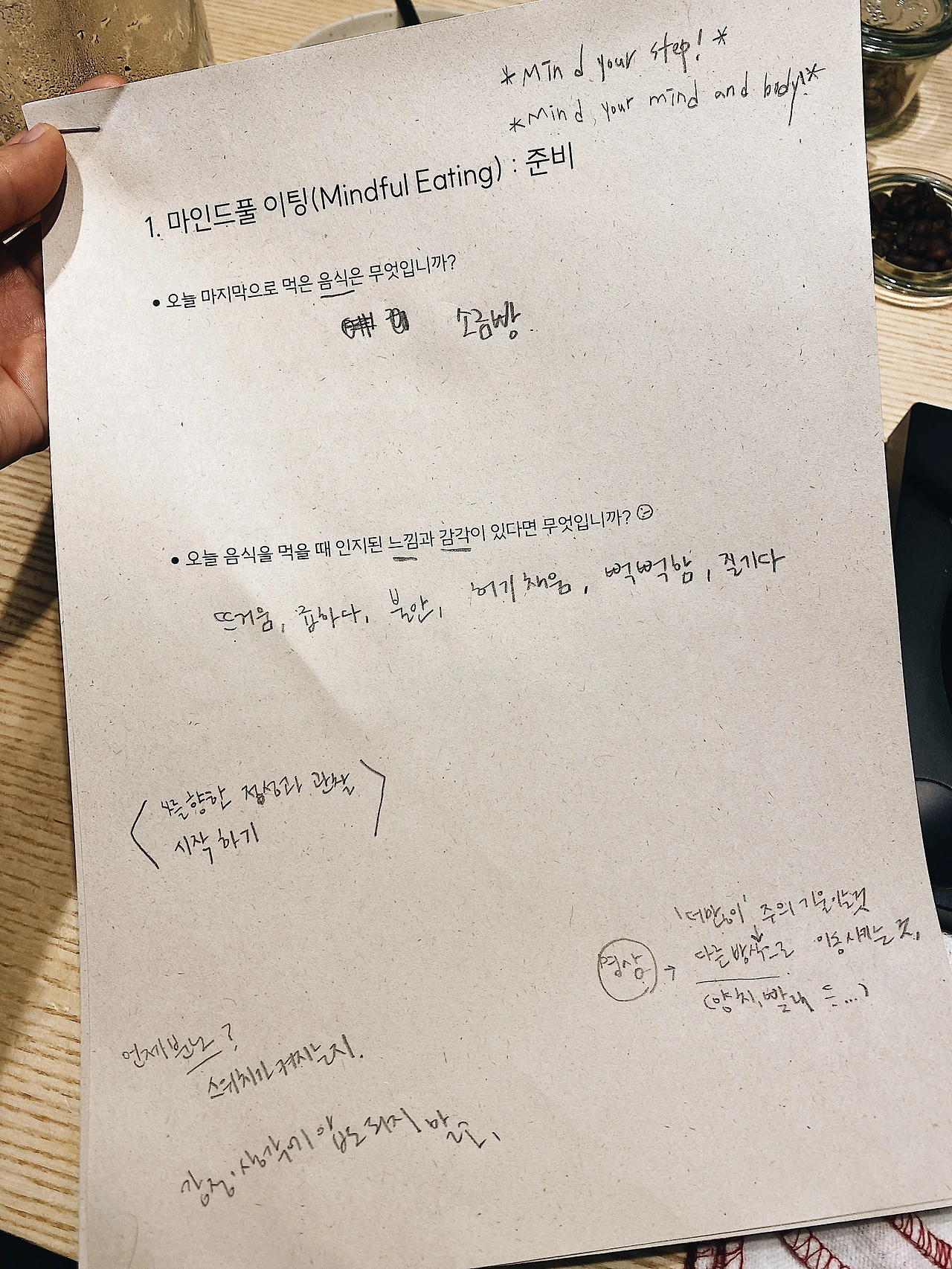 평소의 음식 먹는 행위를 떠올려보고 마인드풀 이팅과 어떤 차이가 있는지 상기시켜보기도 했다. 커피를 마시며 느낀 감각을 각자의 표현으로 공유하며 '아! 저렇게 표현할 수 있다니!' 하며 감탄했다.