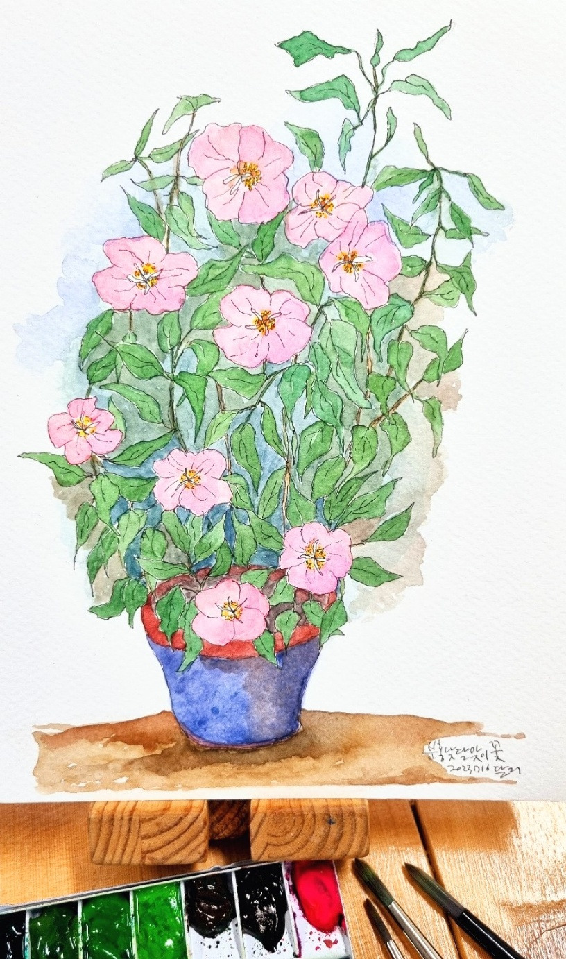 내가 그린 분홍낮달맞이꽃은 달을 굳이 기다리지 않고 낮에도 꽃을 피우는 독립적인 신세대 달맞이꽃이다. 사실 귓속말로 얘기하자면 달맞이꽃이 애타게 기다리는 것은 환한 달님이 아니라 털이 부숭부숭한 박각시나방이다. 밤에 활동하는 야행성 곤충들에 의해 수정이 이루어지기 때문이다. 아이야 산타는 없단다 하고 얄미운 소리를 한것 같지만 생명에게 수정은 얼마나 중대한 일인가.