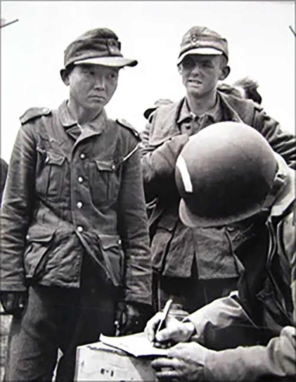 위 사진은 제2차 세계 대전 당시 독일 군복을 입은 한 동양인 병사가 노르망디 상륙작전을 성공한 연합군에게 포로로 잡혀 심문을 받는 장면이다. 노르망디의 유타 해안에서 로버트 브루어라는 육군 중위는 어느 나라 말도 제대로 통하지 않아 심문에 어려움을 겪던 포로를 만났는데 알고보니 한국인이었다. 위 사진에 찍힌 병사말고도 한국인 포로가 몇 명 더 있었다. 도대체 어쩌다가 조선인이 노르망디 해변에서 나치의 군복을 입고 연합군에게 잡히게 됐을까. 사진속 저 왜소한 병사가 본인의 입으로 그 경위를 밝힌 것이 기록에는 없기 때문에 다양한 해석이 생겨났고 소설과 영화로 그 상상력이 확대되었다.
