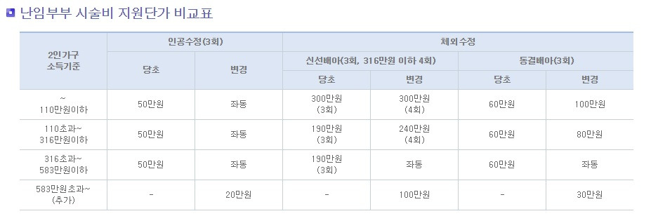 체외수정에 대한 정부지원은 난자를 채취해 바로 수정시킨 신선배아 이식 3번, 이전에 채취해 수정시켜놓은 동결배아 이식 3번 최대 6번까지 지원이 됩니다. 고가의 시술이라 인공수정보다 지원도 많이 되는 편이에요.