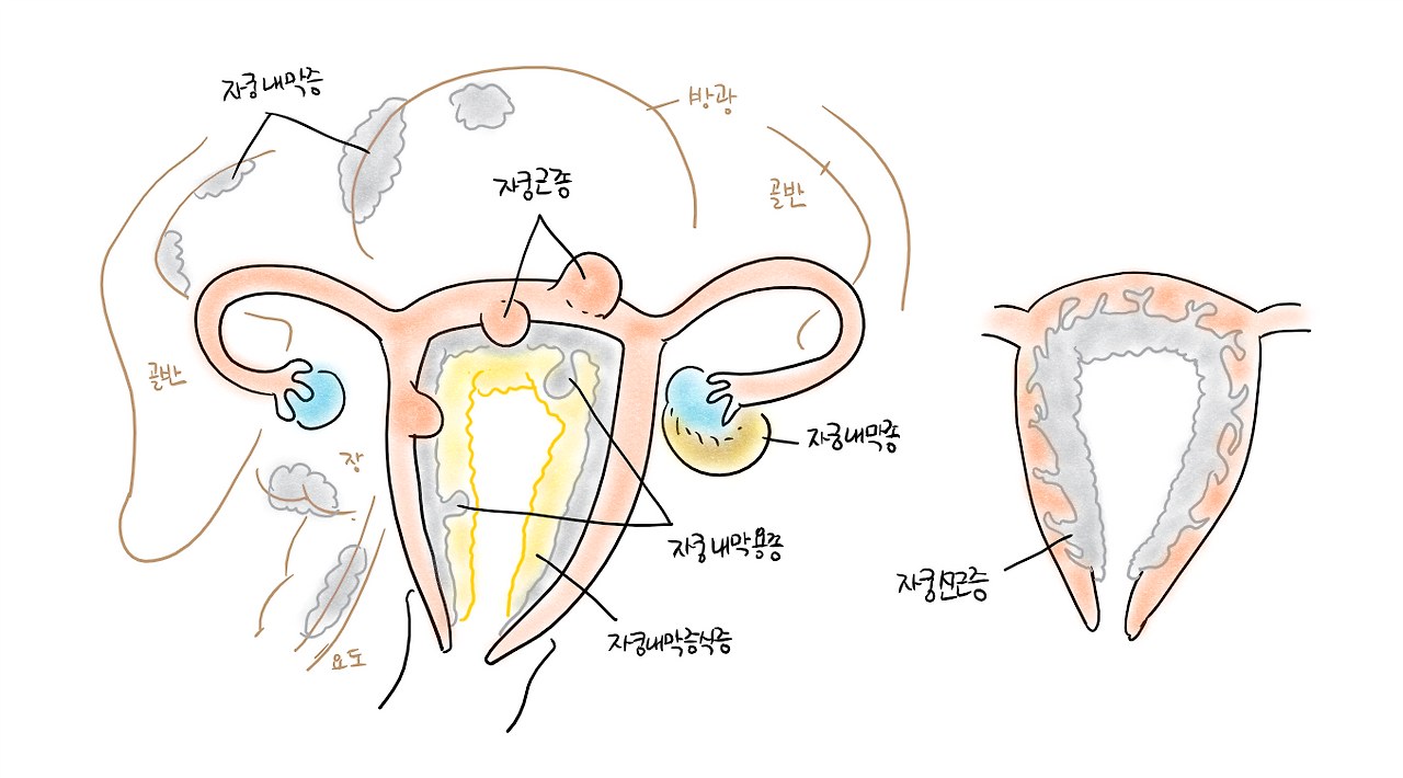 자궁에 관련된 여러 질환을 그림으로 그려보았습니다. 그림도 복잡하네요...