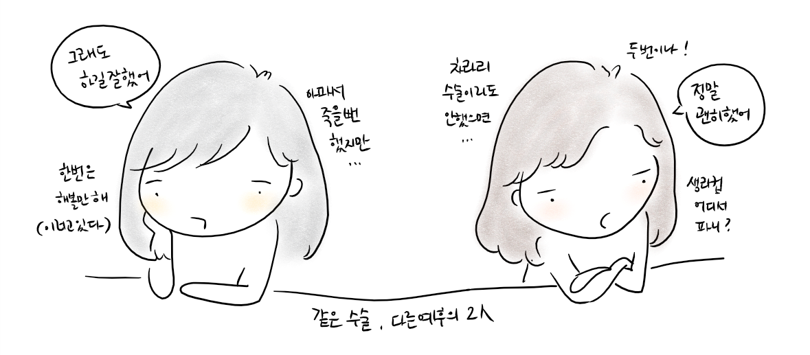 당시에 수술을 결심한 가장 큰 계기는 임신에 대한 대비였습니다. 한때 심했던 월경전 증후군은 한약과 침 치료로 어느 정도 호전된 상태였고, 생리양이 많기는 했지만 참을 수 있었거든요. 무엇보다 수술이 너무 무서웠습니다. 태어날 때부터 병원과는 별로 친해본 적 없는 삶이어서 이런 내가 의료인이 되다니 아이러니라고 생각했는데 나이가 차서 부인과 쪽으로 접어드니 웬걸 대반전, 때마다 병원에 안 가는 게 더 이상한 몸인 걸 깨달았습니다. 한가롭게 병원과 내외하고 있을 입장이 아니었던 거지요.