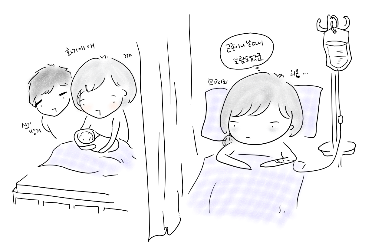 출산한 산모는 제왕절개했는데도 벌떡벌떡 일어나곤 하더군요. 저는 돌아눕는 것도 힘들었는데 말입니다.. (왠지 초라했어요)