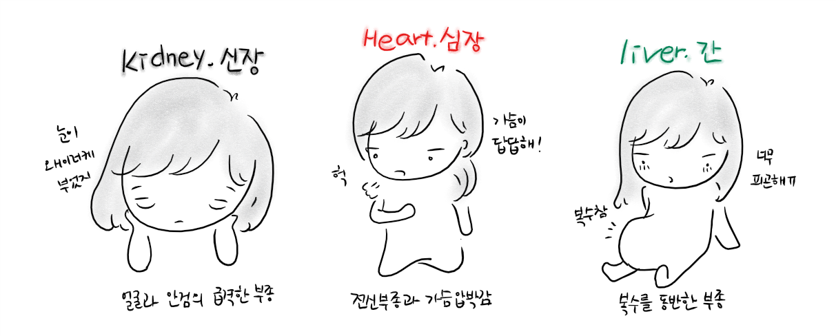 부종을 검색해보면 다양한 원인이 나옵니다. 우리는 부으면 '신장에 문제가 있나'라고 흔히 생각하지만 의외로 몸이 붓는다고 신장내과를 찾는 사람 중 진짜 신장에 문제가 있는 사람은 1백 명 중 3명밖에 안된다고 신장내과 전문의가 말하기도 했지요그와중에 100명 중 95명이 여자라는 게 함정.1) 신장뿐 아니라 심장, 간, 갑상선의 문제도 부종을 일으킬 수 있습니다. 그중에서도 부종 3대 장기라 불리는 심장, 신장, 간의 이상으로 붓는다면 문제는 조금 심각할지도 모릅니다. 부종을 일으키는 심부정맥혈전증이나 신부전, 간부전은 무서운 병이지요.