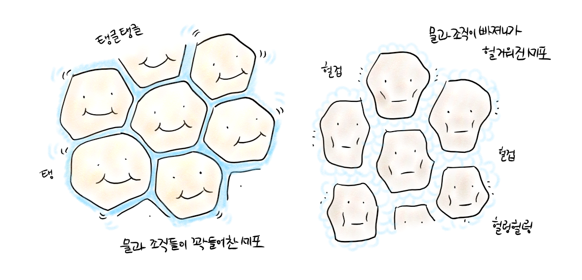 교원질은 피부, 뼈, 인대 등 인체를 구성하는 단백질 종류예요. 폐경 이후 이 물질이 서서히 줄게 됩니다. 피부의 교원질이 줄면 피부가 얇아지고 건조해집니다. 근육도 약화되어서 요실금을 일으키거나 관절의 통증을 일으키기도 하지요. 폐경 후 첫 5년 안에 몸 전체 교원질의 약 30%가 줄어든다는 연구가 있습니다.