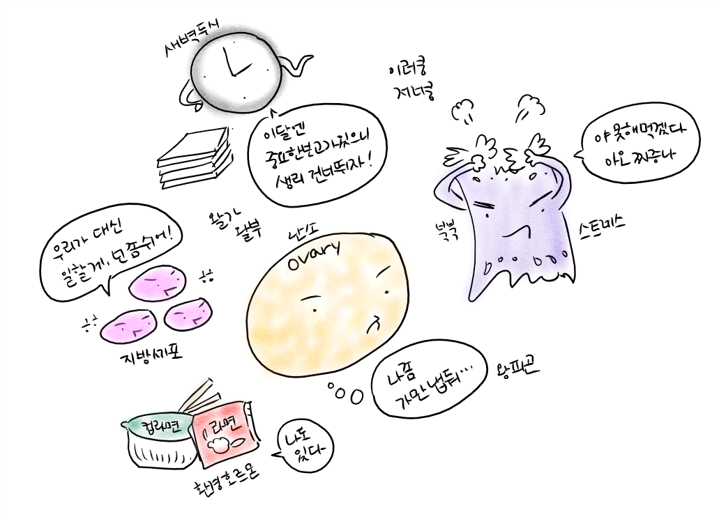 젊어서 너무 일을 많이 하면 나이 들어서 일이 하기 싫습니다인지상정. 난소의 노화도 비슷한 수순을 밟는다고 생각하시면 돼요. 태어나면서 이미 정해진 개수의 난자를 차례차례 준비해서 내놓는 것이 난소의 일이기 때문에 35년간의 긴 마라톤을 완주하려면 지치는 것도 당연한 셈입니다. 게다가 난소의 기능을 결정하는 것은 유전적인 요인만큼 후천적인 요인도 커서 참견하고 훈수를 두는 '환경'이 한두 가지가 아니에요. 점점 심해지는 스트레스, 일 때문에 흐트러진 생활리듬, 1인 가구가 늘면서 생기는 영양의 불균형, 다이어트와 비만 사이에서 깨져버린 체지방의 밸런스까지. 여자의 난소는 시어머니가 열두 명인 며느리입니다.