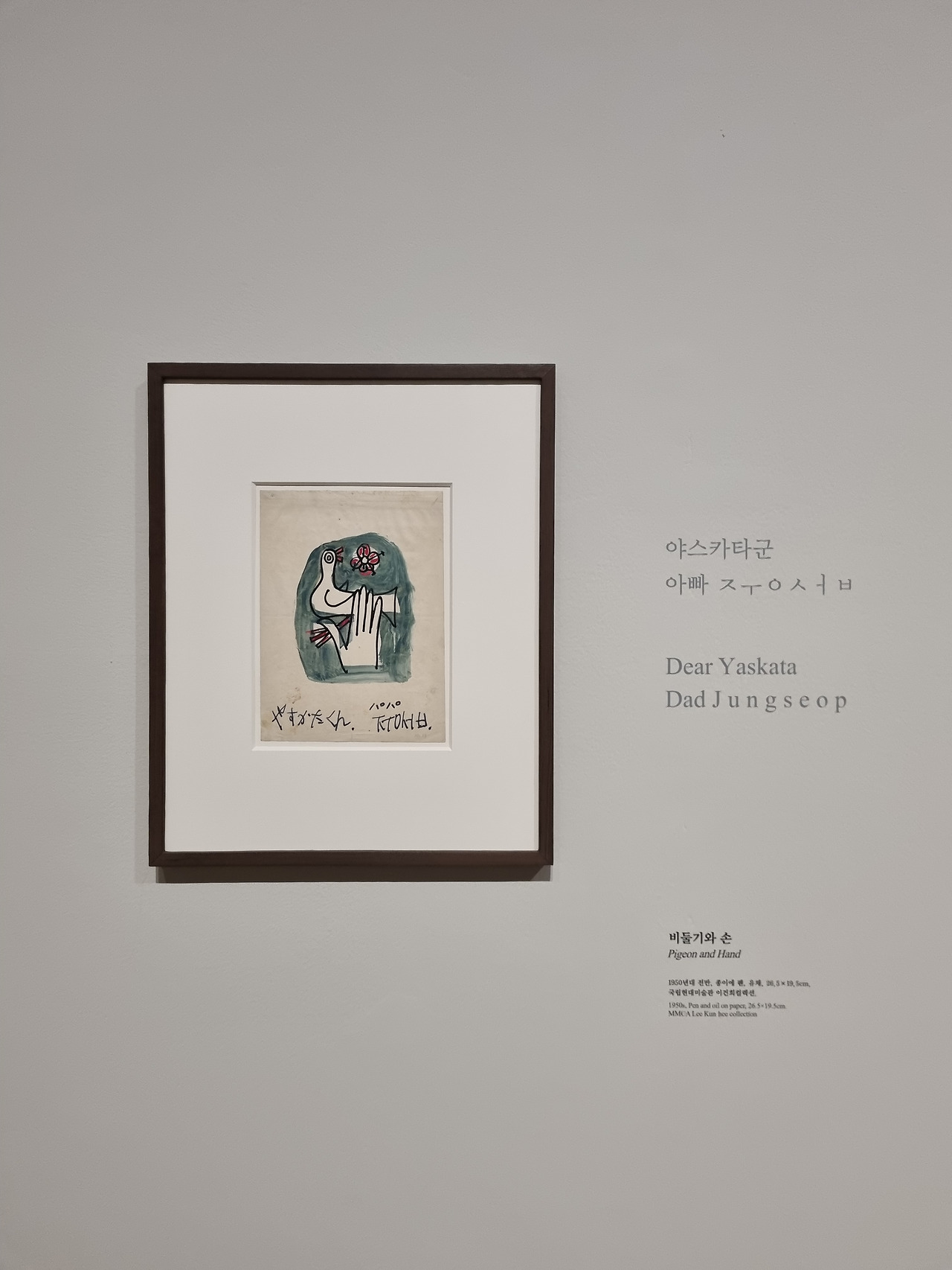 그리고 그의 생애를 간략하게 설명하는 텍스트가 있었는데, 거기서 그가 피란생활을 하다가 상황이 어려워져 1952년에 아내와 두 아들을 일본으로 보내고, 홀로 병마와 싸우다 1956년에 '무연고자로 생을 마감'했다는 사실을 알게 되었다. 난 이 사실을 처음 알았고, 벽에 붙은 그 짧은 텍스트에서 눈을 떼기가 힘들었다. 이렇게 애처가인 사람이, 가족과 떨어져 살다가 홀로 생을 마감했다니? 그 유명한 작가 이중섭이 이렇게 쓸쓸한 죽음을 맞이했었다니?