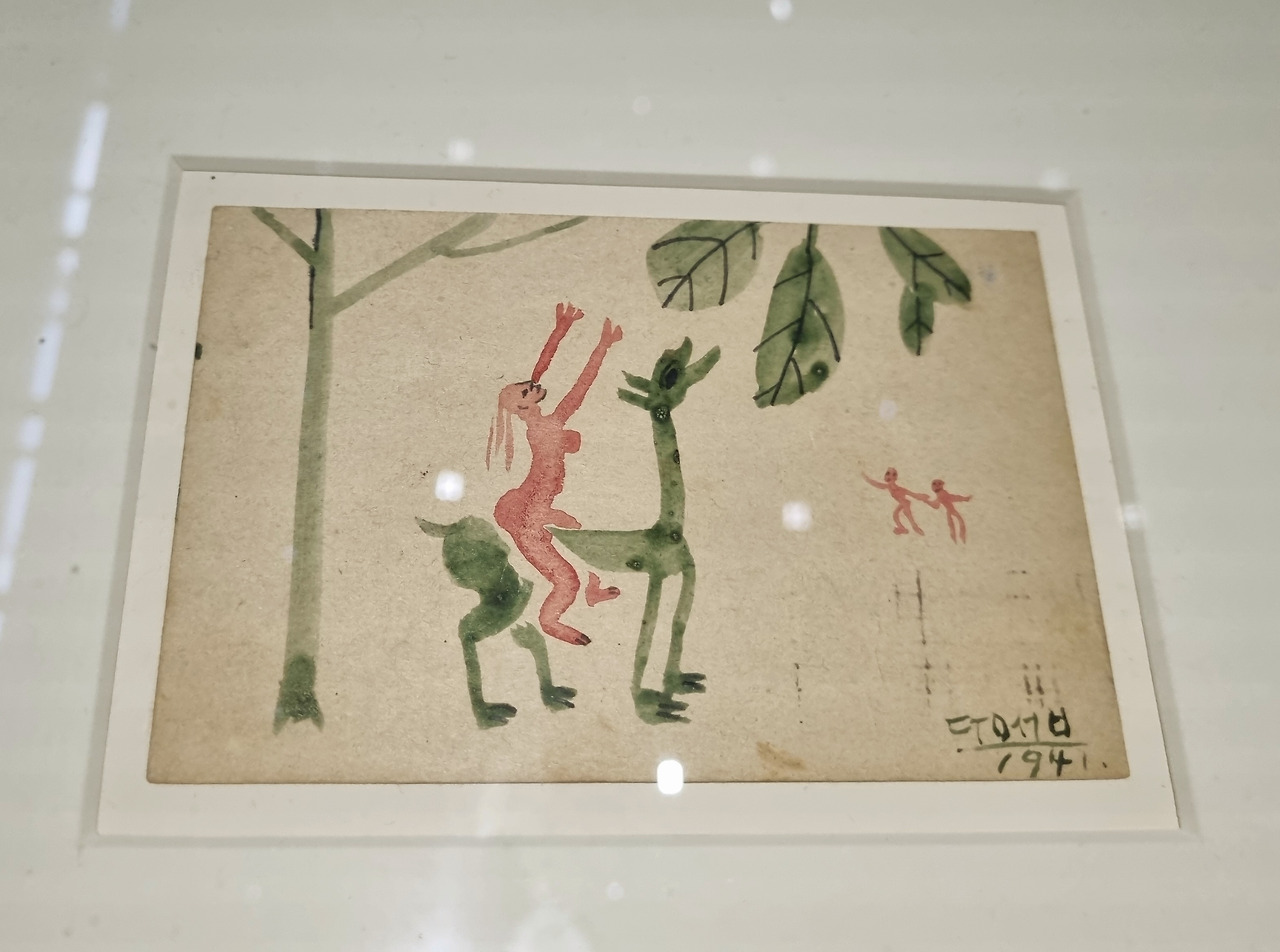 전시장 초입에는 그동안 보지 못했던 소형 그림이 많이 걸려 있었다. 그가 직접 그려 두 아들에게 보냈던 엽서, 떨어져 지내는 동안 아이들과 가족을 소재로 그린 그림들이었다. 엽서의 그림은 그림체가 귀여웠으며 쨍한 색감이 아니었음에도 오묘하게 조화롭고 예뻤다.