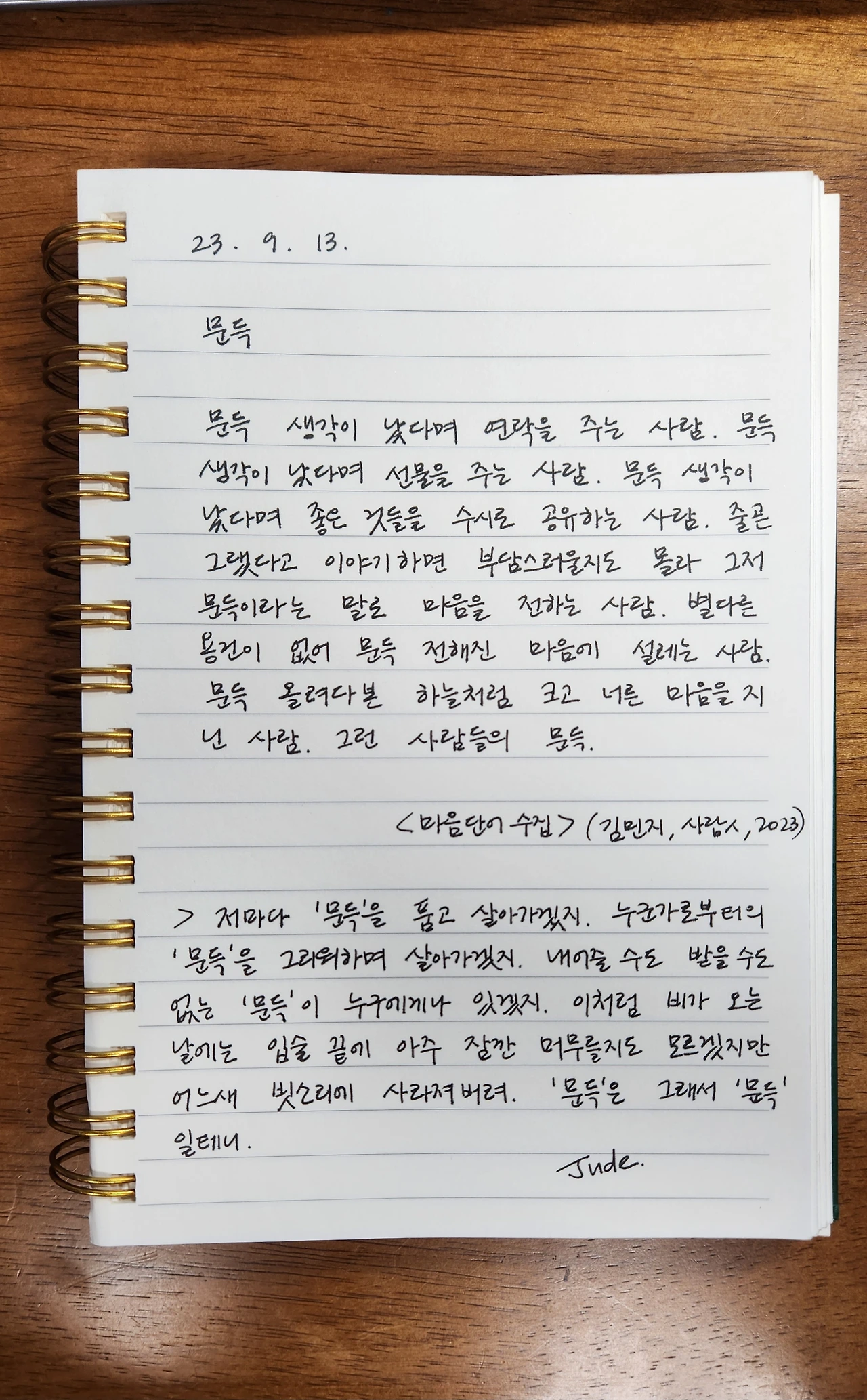 저마다 '문득'을 품고 살아가겠지. 누군가로부터의 '문득'을 그리워하며 살아가겠지. 내어줄 수도 받을 수도 없는 '문득'이 누구에게나 있겠지. 이처럼 비가 오는 날에는 입술 끝에 아주 잠깐 머무를지도 모르겠지만 어느새 빗소리에 사라져버려. '문득'은 그래서 문득일테니.