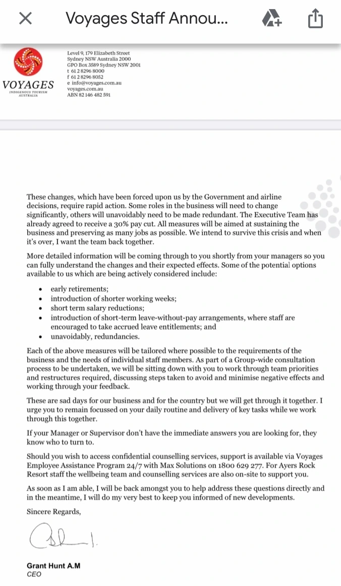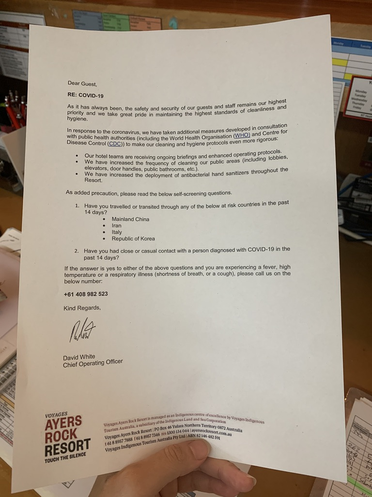 국경이 완전히 폐쇄되기 시작한 20일로부터 딱 하루 지난 21일, 이번엔 3일 후부터 내가 있는 NT주가 봉쇄되어 다른 주에서부터의 출입이 제한된다는 발표가 갑작스럽게 나왔고 연이어 다른 주들도 차례차례 봉쇄되어 국외가 아닌 호주 자국 내에서조차 이동에 제약이 생기게 되었다. 시드니나 브리즈번 등 다른 도시와 여기를 오가는 모든 비행기들도 4월 전으로 모두 취소되었고 무엇보다도 울룰루와 카타주타가 있는 국립 공원마저 아예 문을 닫게 되었다. 그러자 회사 경영진 측에서 4월 1일부터 7월 1일까지 공식적으로 1개를 제외한 모든 호텔들의 운영을 중단하겠다고 급하게 결정을 내렸고 22일에 곧바로 그와 관련한 공지를 개별 이메일과 담당 부서를 통해 전달받았다.