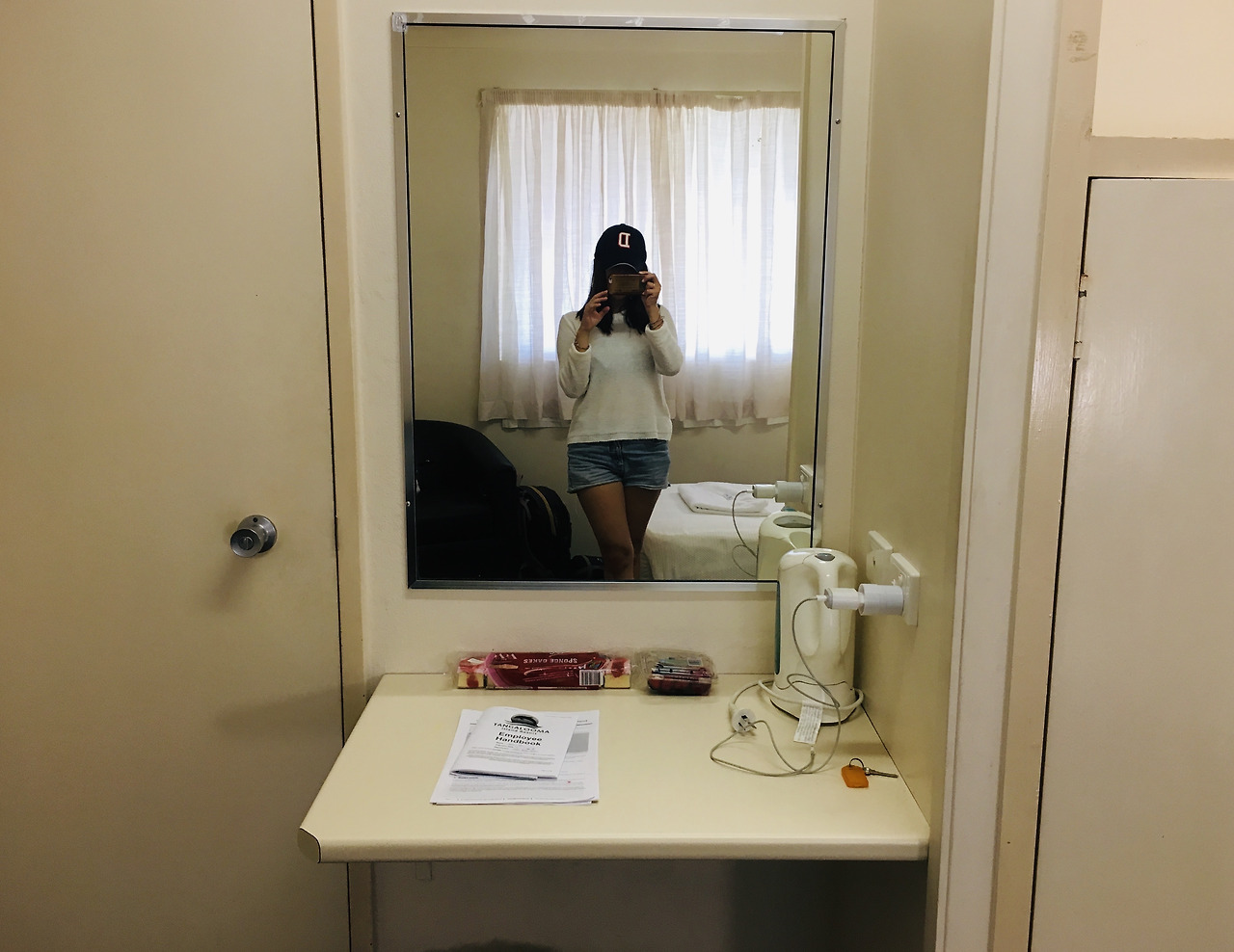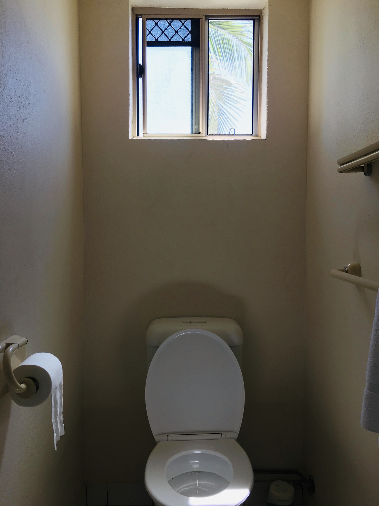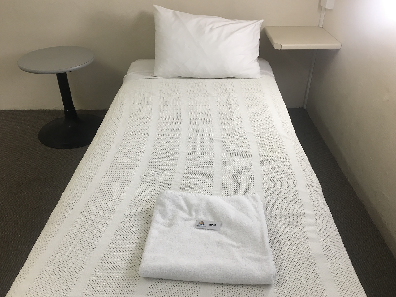 개인적으로 좋아하는 숫자 중 하나가 10이라 방 키를 받자마자 기분이 좋았는데 방문을 열어보고 나서는 저절로 탄성까지 나왔다. 비록 화장실만 딸려있는 방 한 칸이지만 나 혼자 지내기엔 넉넉하고 무엇보다도 침대 옆쪽에 나있는 창문으로 바로 보이는 바다와 야자수 풍경이 그림 같아 사실 그 자체만으로도 충분히 좋았다. 심지어 화장실 변기 위로 난 창문으로도 야자수와 파란 하늘이 보인다. 화장실 주제에 이런 뷰라니. 침대 위에 가지런히 접힌 수건 위에 놓인 MINJI라고 적힌 명찰도 눈에 띄었다. 그걸 보니 그제야 실감이 나기 시작했다.