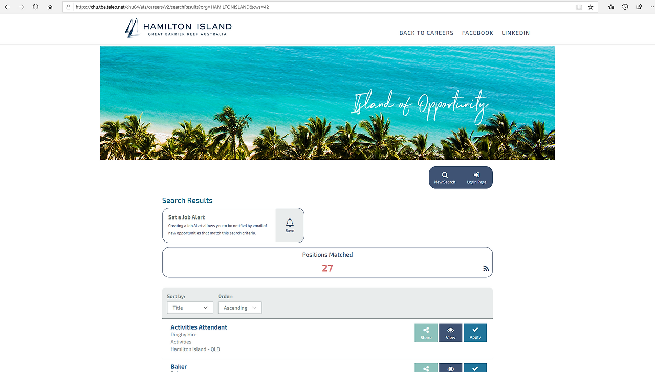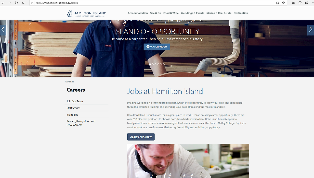 아래와 같은 해밀턴 아일랜드 홈페이지 커리어란을 살펴보면 구인공고 사이트보다는 자체 홈페이지를 통해서 지원하는 방법이 더 구체적이고 잘 활성화되어 있다.