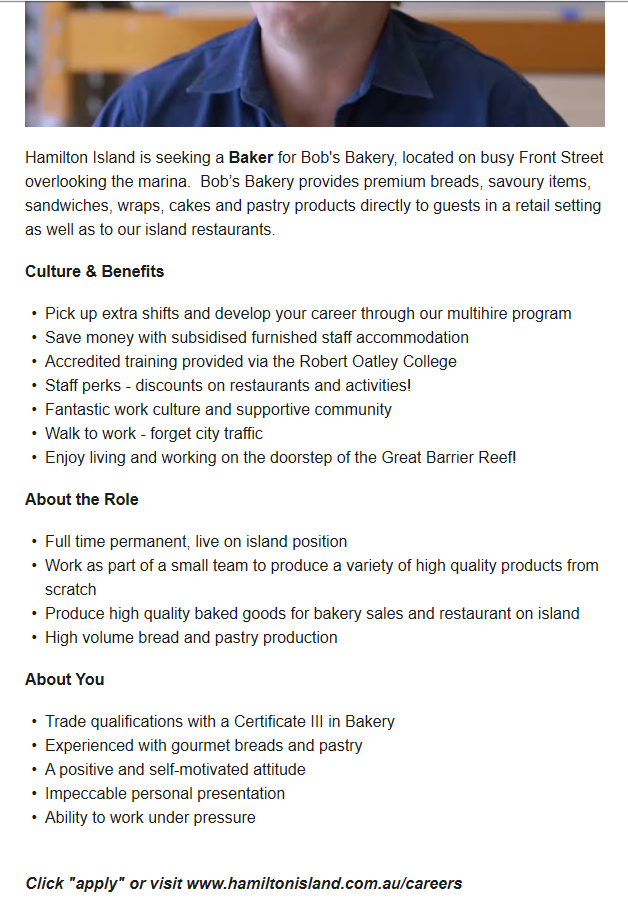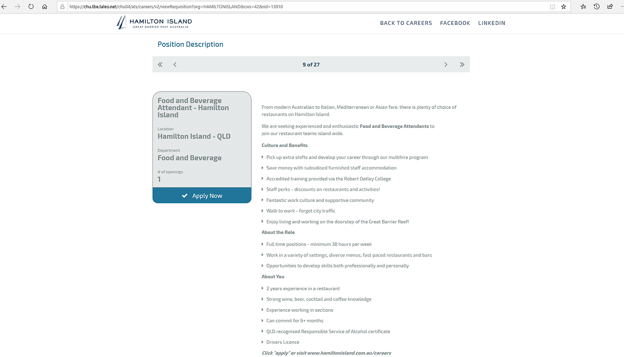 그다음에 한 일은 이제 그 리조트에서 할 수 있는, 하고 싶은 일 알아보는 것. 각 리조트 홈페이지에서 Career 카테고리를 들어가 보면 어떤 일에 관해 구인 중인지, 지원 방법은 어떻게 되는지, 그리고 예를 들면 해밀턴 아일랜드의 홈페이지 같은 경우에는 각각의 일자리마다 필요한 요구 자질이나 특징까지도 자세히 나와있는 것을 볼 수 있다.