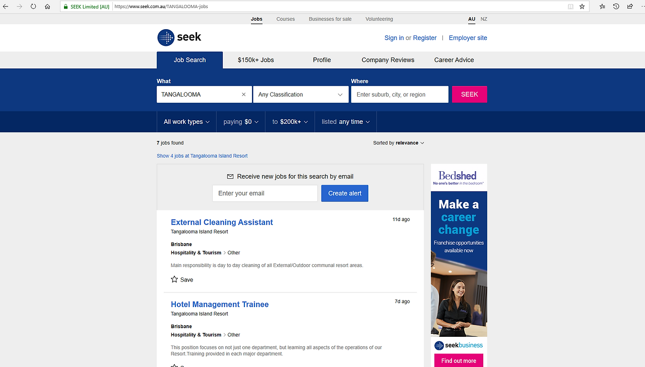 SEEK에서 다음 예시와 같이 내가 관심 있는 곳을 구체적으로 입력하거나 아니면 Resort와 같이 키워드만 적어서 검색해보면 이와 관련해 현재 구인 중인 일자리가 쭉 뜬다. 그렇지만 해밀턴처럼 자체 홈페이지를 통해 지원하게 돼있는 곳은 이런 구인공고 홈페이지에 모든 일자리가 올라오는 게 아니라서 나는 수시로 자체 홈페이지와 구직 사이트를 함께 살펴보곤 했다.