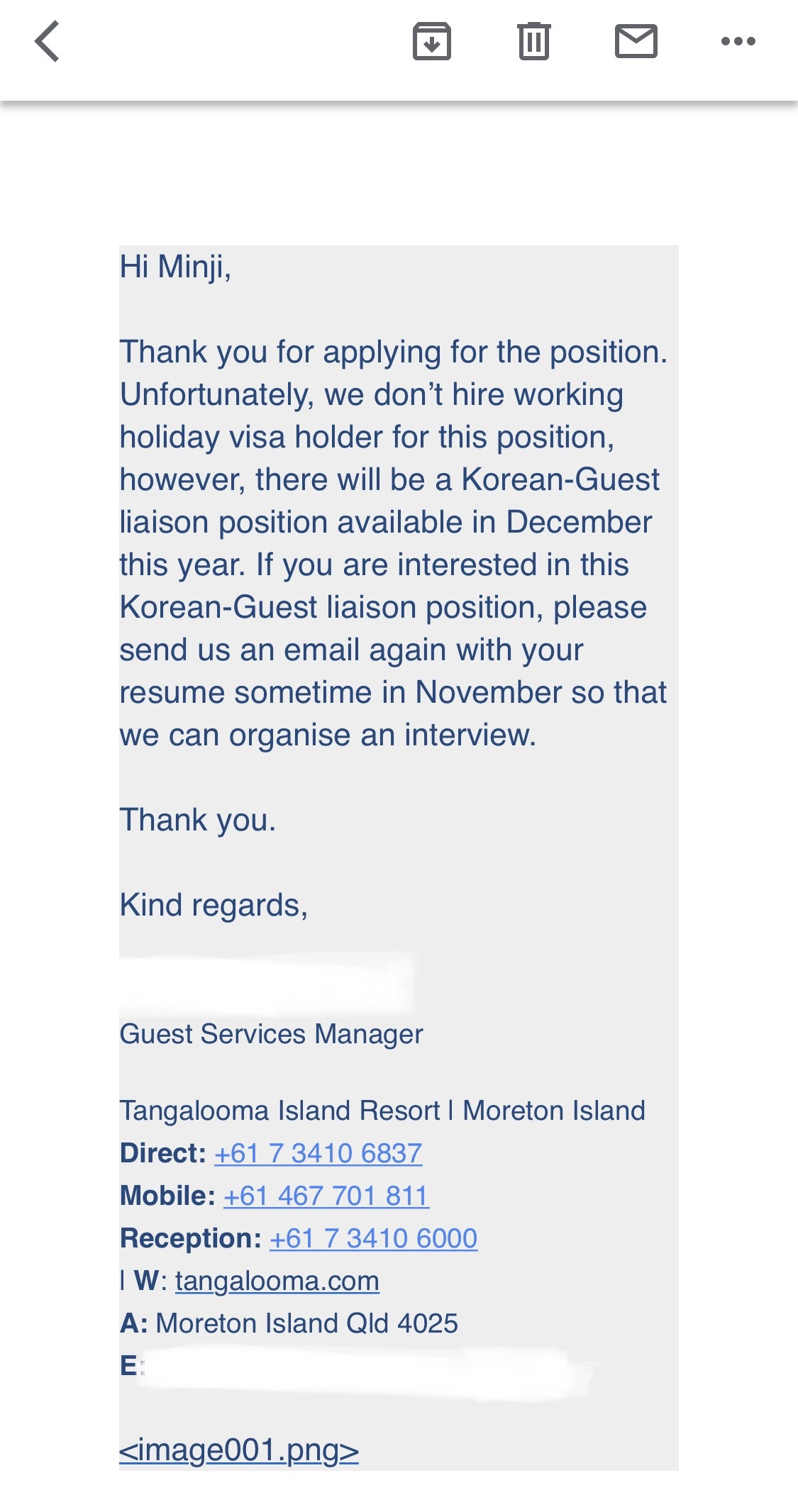 비록 내가 지원한 이 포지션은 워홀 비자 소지자는 채용하지 않지만 대신 올해 12월 중에 Korean guest liaison 채용이 있을 수 있으니 관심이 있다면 구체적인 인터뷰 일정을 잡을 수 있게 11월 중에 다시 이력서를 보내 달라는 내용.