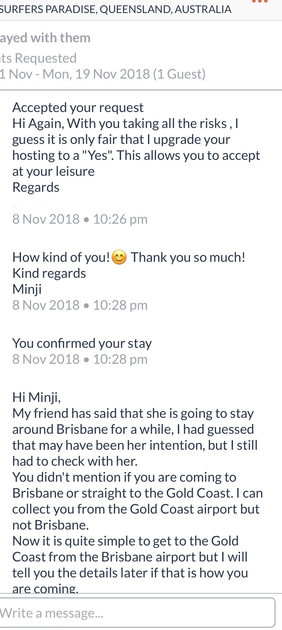 그러던 중에 떠날 날이 이틀 남은 8일, 운 좋게도 20번째 호스트에게 Accepted라는 답변을 받았다. 심지어 요청을 보낸 모든 호스트들 집 중에서도 골드코스트의 중심부인 서퍼스 파라다이스여서 위치적으로도 가장 좋은 곳이었다.