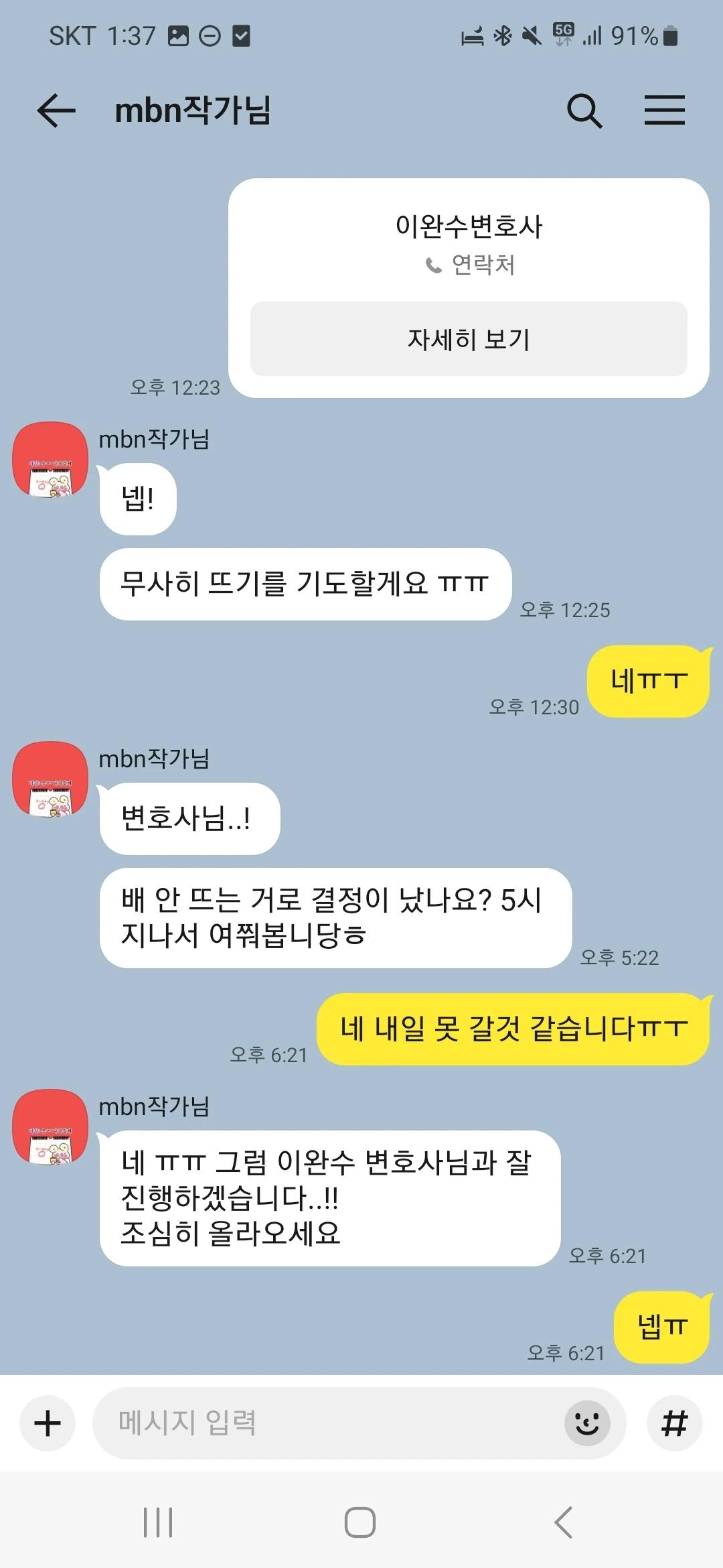 포기하지는 않았지만 그다음 날 있을 생방송에 지장이 있으면 안 되기에, mbn 생생정보마당 작가님께 전화를 걸어 상황을 설명하고 나의 갑갑한 상황을 가장 가까운 사람들에게 알렸다. 결국 내일 방송은 내가 어려운 일이 있을 때마다 언제나 나를 도와주시는 이완수 변호사님이 대신하여 나가시는 것으로 마무리가 되었다. 한편 나는 도대체 언제 육지로 나가게 될 것인가, 아니 돌아갈 수는 있을 것인가. 거센 바람속에 갇힌 나는 점차 자신이 없어졌다.