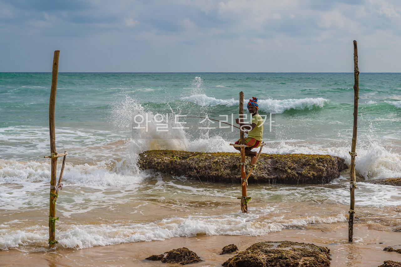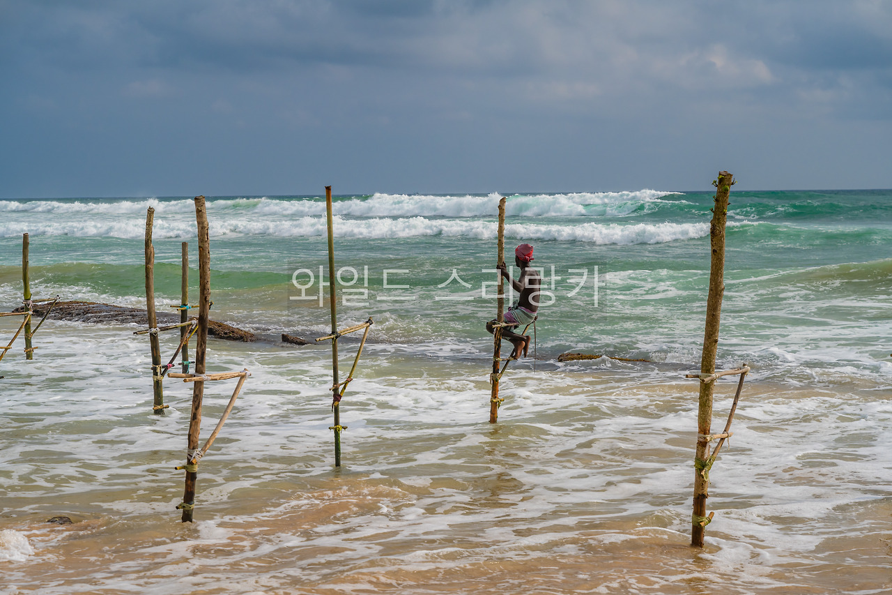 아항가마를 지나 코깔라 해변에 도착했을 때 열 명 정도 되는 어부들이 스틸트피싱을 준비하고 있었다. 이게 웬 떡인가 싶어 액셀을 당겨 해안가 목 좋은 곳에 뚝뚝을 세웠다. 그때 승합차 한 대가 들어오더니 중국인 관광객이 우르르 내렸다. 먼저 내린 가이드는 어부들의 대표로 보이는 사람에게 몇 가지 당부를 전했다. 어부들은 개학 날 교실을 청소하는 고등학생처럼 느릿느릿 움직였다. 그때 가이드가 사진을 찍으려는 우리를 발견하고 말했다.