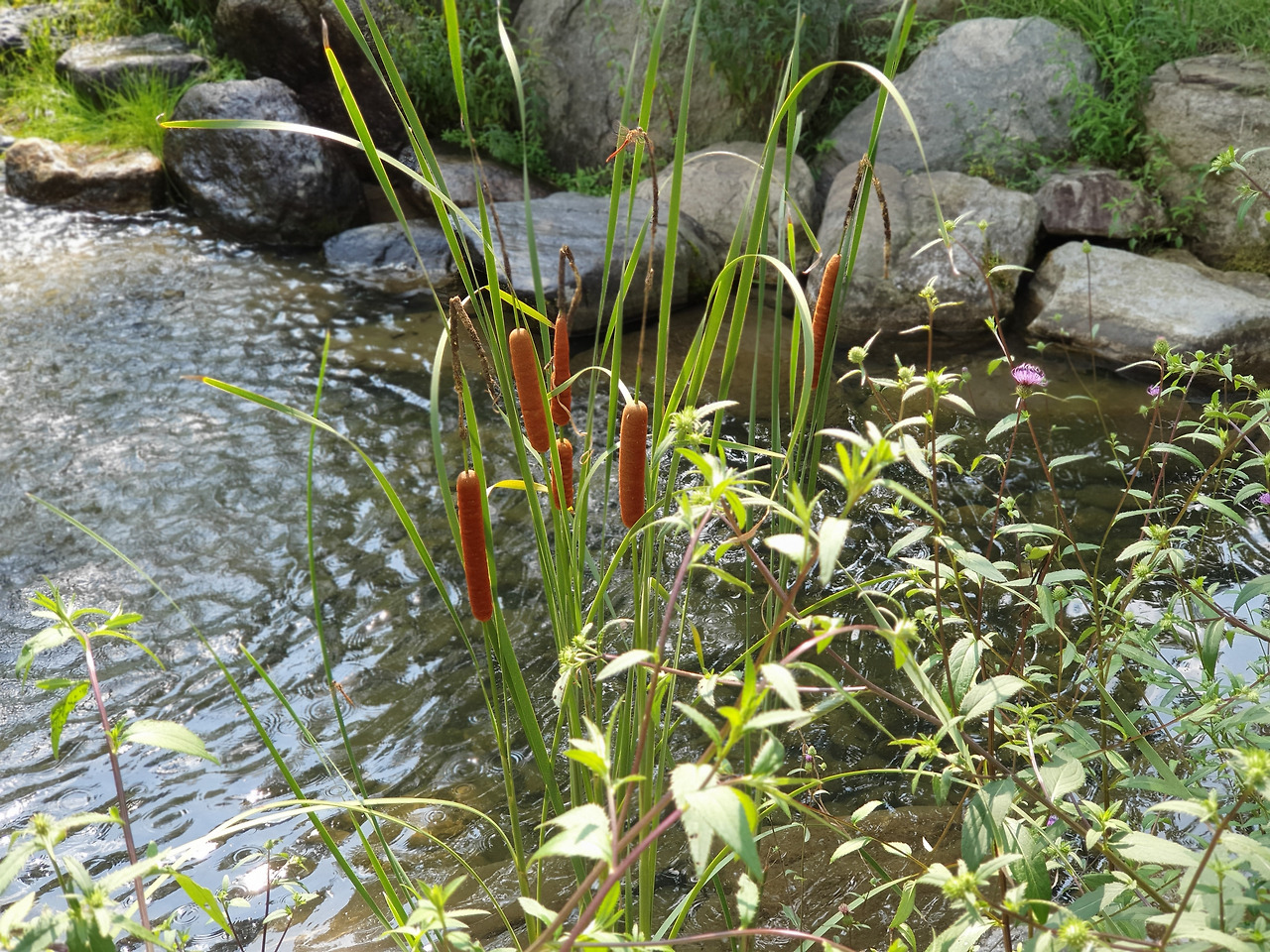 소시지 같은 둥글고 긴 모양의 잎이 붙어있는 식물 '부들'