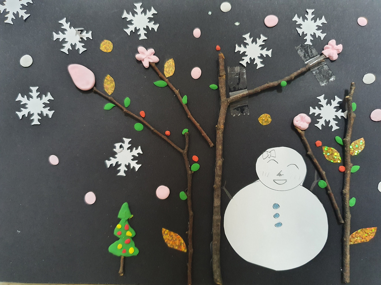 ◇방법 : 검은 종이에 마른 나뭇가지를 붙이고, 클레이, 색종이, 스티커로 예쁘게 꾸미기