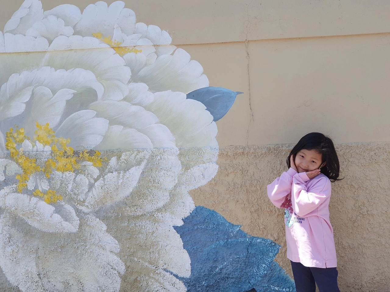 자기 몸보다도 큰 꽃들이 신기했는지, 자꾸 사진을 찍어달라던 둘째였다. 벽화 구경에 신이 난 둘째 덕분에 골목 벽화 구경을 다하고서야 밥을 먹으러 갈 수 있었다.