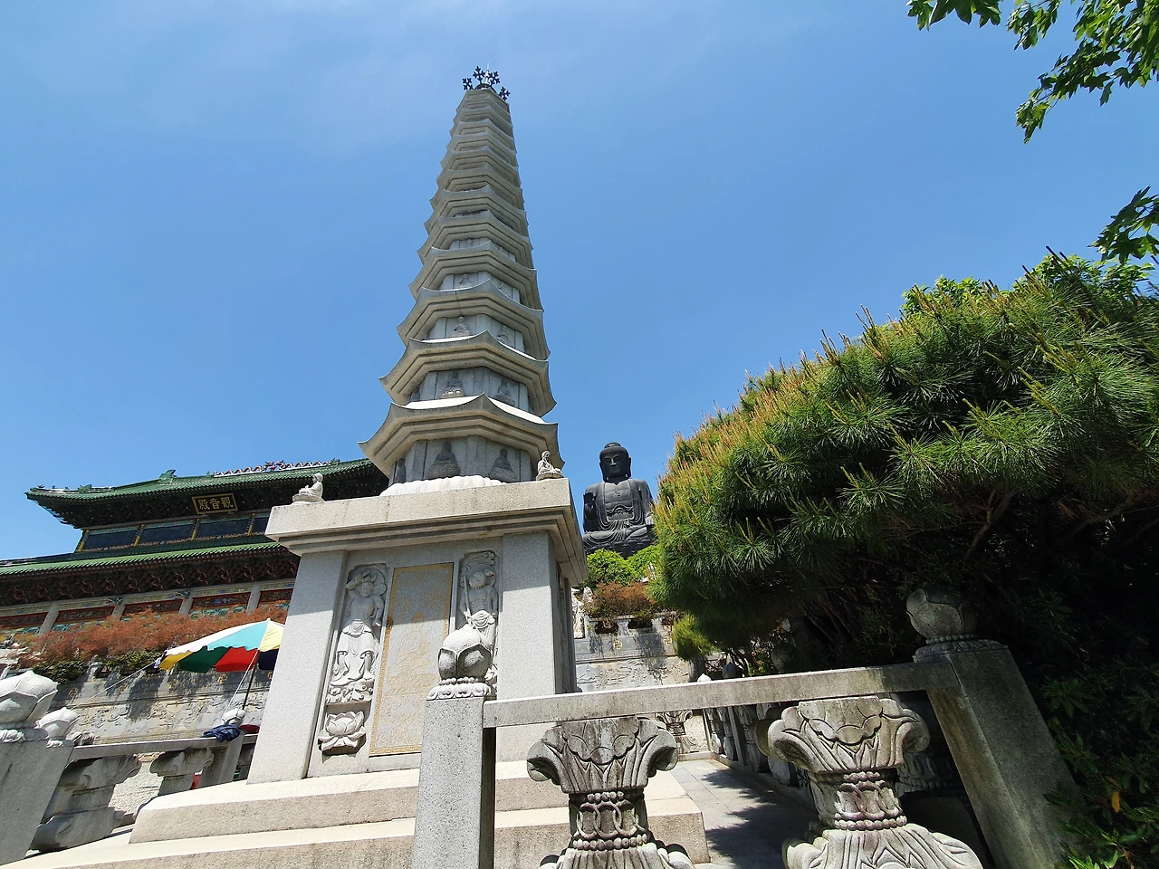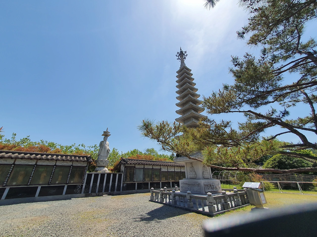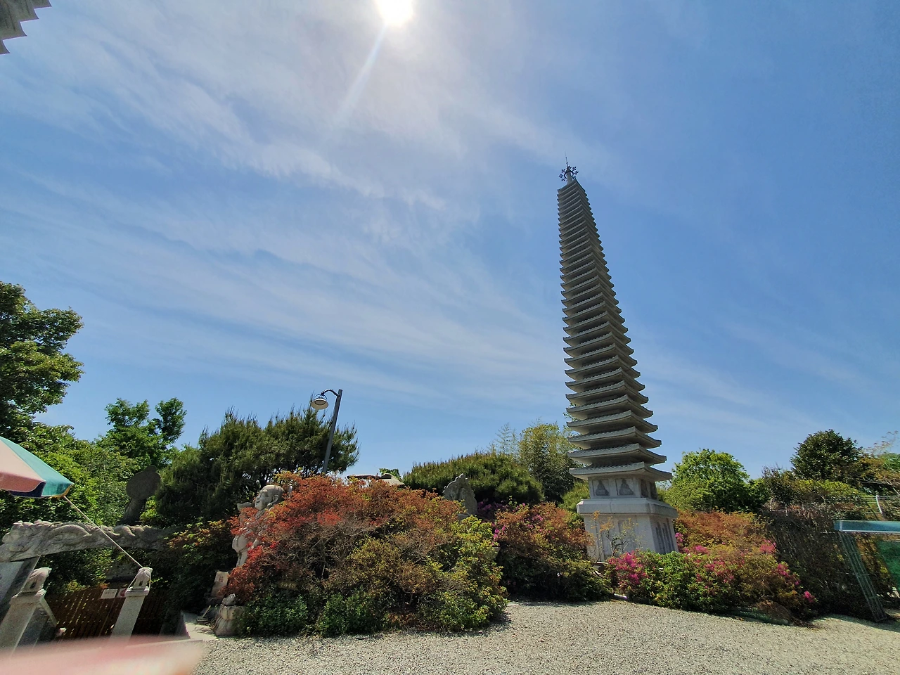 "팔각 13층 석탑, 사각 33층 석탑, 18m 해수 관음보살, 높이 36m, 둘레 32m의 동양 최대 아미타 대불(황동 좌불) 등이 있다."